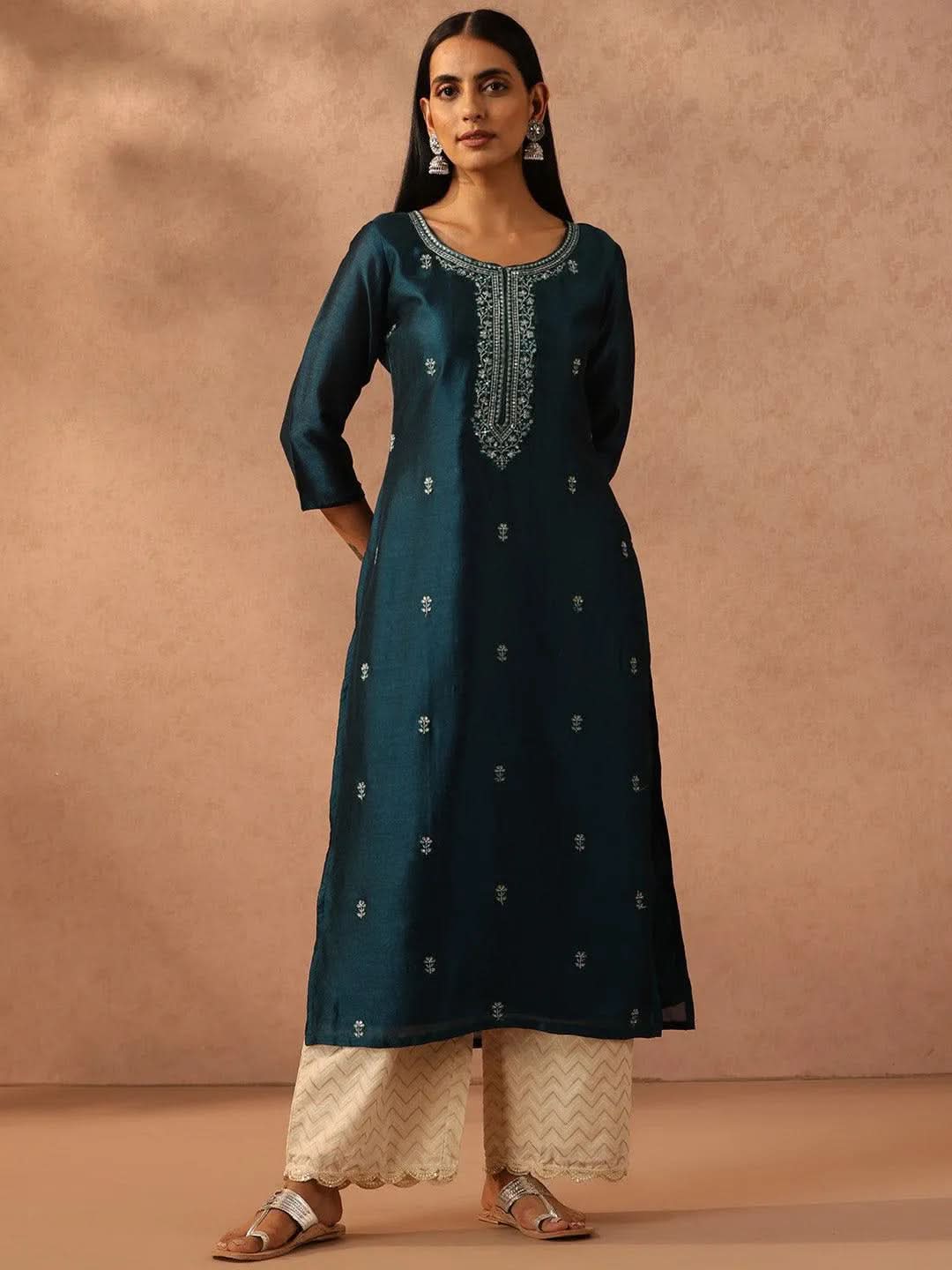 Yet another option in your list of hairstyles for suits can be the traditional long straight hair that stays at the back. Hairstyles for kurti and suit gives an extremely clean and neat look while channelling your inner feminine energy. This teal green straight-fit kurta by Libas features a round neckline and comes with three-quarter sleeves.