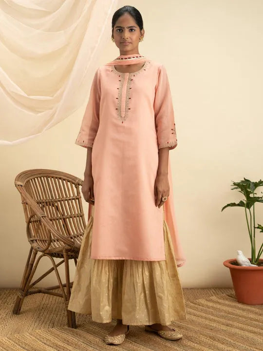 An ode to the shades of festivities and celebratory affairs filled with fall feels and joy. Adorn the soirée with this zari embroidered sharara suit set in a pastel pink palette crafted in sumptous silk fabric. The splendid ensemble consists of a knee-length kurta, a foil print sharara and a gota-lace dupatta, further elevate your festive look with a traditional selection of accessories like jhumkas and embellished potli along with a pair of comfortable heels or mojaris.