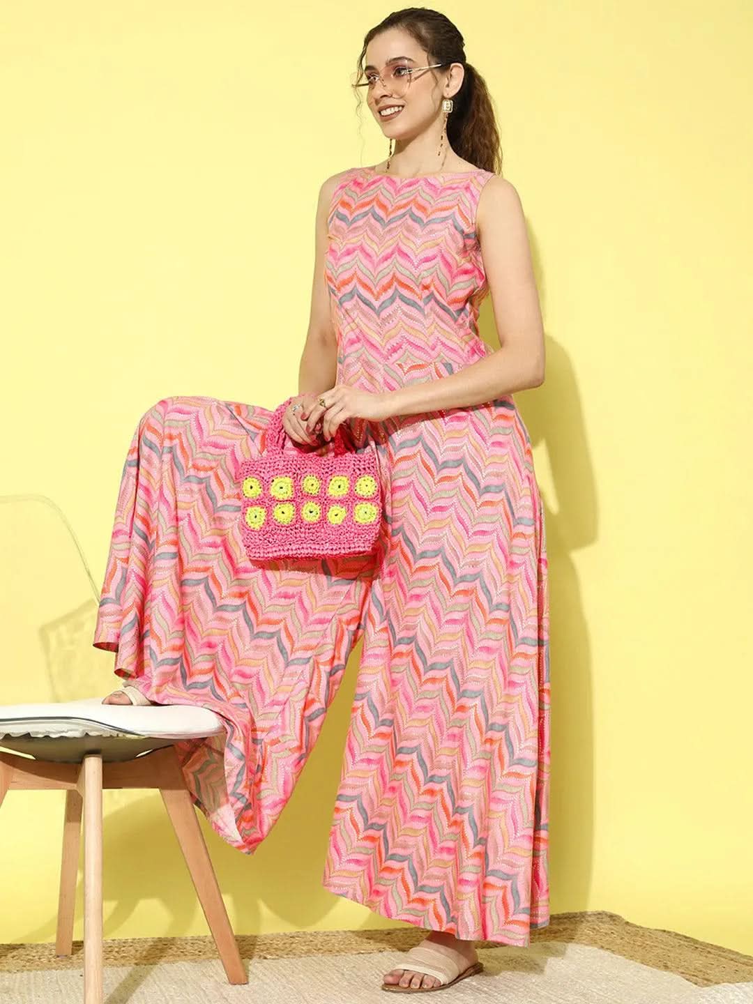 Libas features an extensive collection of long dresses for women, and it cannot be complete without our pink jumpsuit. The sleeveless design and flared silhouette of this jumpsuit elevate its chic element, and the rayon fabric ensures comfort and breathability at the same time. This long dress design features a harmonious blend of multicoloured print on a bold pink base, making it a charming modern outfit that you can style for casual outings with friends and family. Add a twist of contemporary fashion to your wardrobe with long dress designs for ladies from Libas.