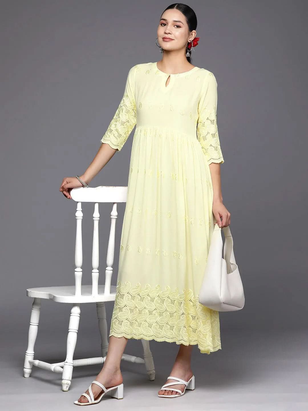 With this long dress, we bring into the spotlight a breath of fresh ethnic charm. Our yellow fit and flare maxi dress blends ethnic and contemporary fashion. This graceful long dress design is adorned with a statement yoke, handcrafted Doris, and Gota Patti accents on the hemline and sleeves. When searching for a long dress design for wedding parties or other occasions, this gorgeous dress can be an excellent choice.