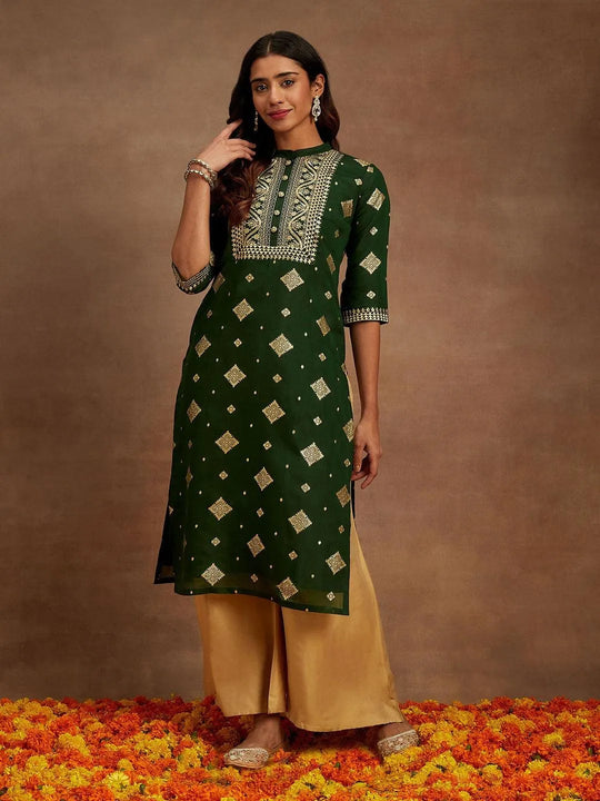 Style a luxurious kurti look for Diwali at your office party with this dark shade of green. Made from lavish Chanderi silk fabric accompanied by exquisite floral embroidery, this flamboyant kurta is the perfect outfit for someone who has a sophisticated fashion style. The Mandarin collar and straight silhouette add elegance to your personal style instantly. For a modern yet traditional Diwali look in Kurti, choose this plush kurti from Libas.