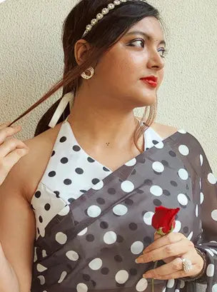 A black and white polka dot saree with a sweet halter blouse, offers a fun, flirty look for daytime events. For a glamorous evening soiree, choose the ready-to-wear floral printed sarees. Achieve the retro look with oversized bow-hair clips, jewelled headband, dainty earrings, and a red rose. This ensemble brings alive the Bollywood retro look in saree with a modern twist, perfect for a themed party or casual gathering.