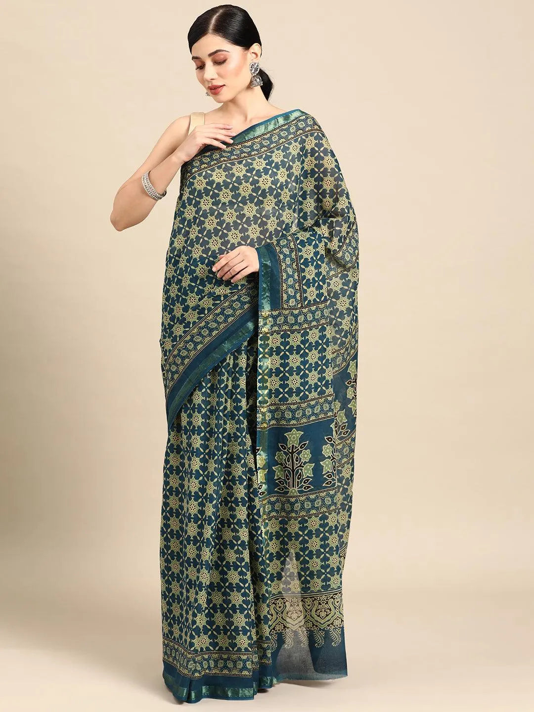 Make a statement in an ethnic look with this best saree colour combination, a blue printed cotton saree from Libas. This two colour combination saree is crafted with attention to every last detail, demonstrating how heritage and modern fashion can coexist in harmony.