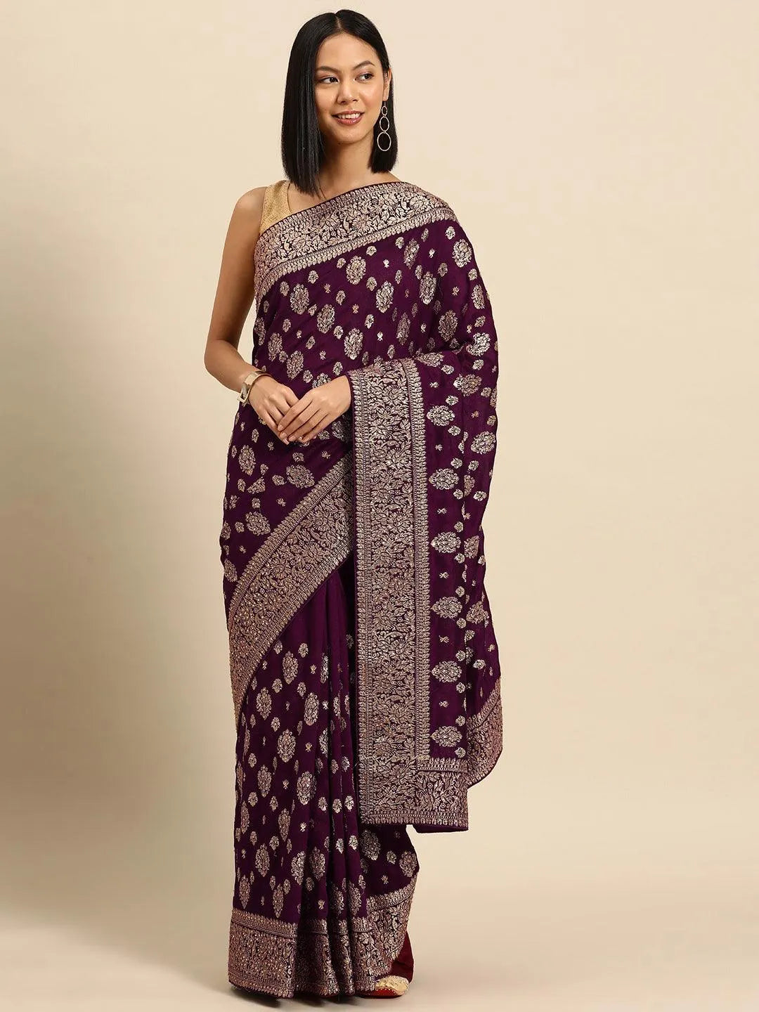 Gorgeous embroidered silk blend colour combination for sarees by Libas will elevate your occasion look. This burgundy saree is artistically crafted, oozing luxury and grace, making it the ideal option for festive occasions. This silk saree drapes gracefully and has a regal appearance.
