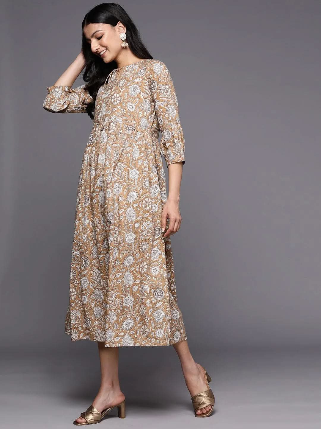 One of the modern and unexpected pairings of modern fashion is two minimalist and subdued hues blended together. And the striking contrast between them evokes sophistication and grandeur. Create a riveting effect in this charming empire line dress highlighting tassel detailing neckline, three-quarter bishop sleeves, elegant foliage print, and pleated accents.