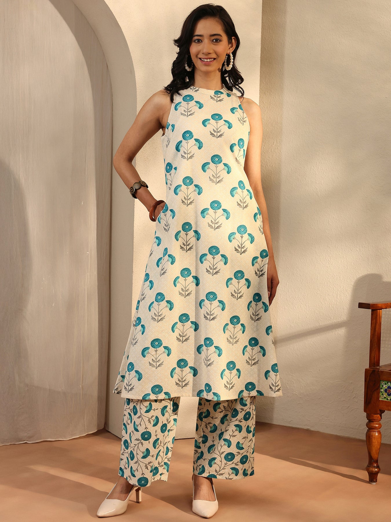 Our 2-piece off white and turquoise blue cotton A-line set features a round neckline and statement yoke. Complemented with palazzo pants with a partially elasticated waistband. Adorned with floral printed, this style is perfect for work wear and casual wear.
