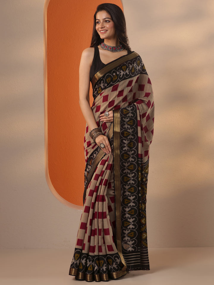 Beige Printed Silk Blend Saree With Unstitched Blouse Piece