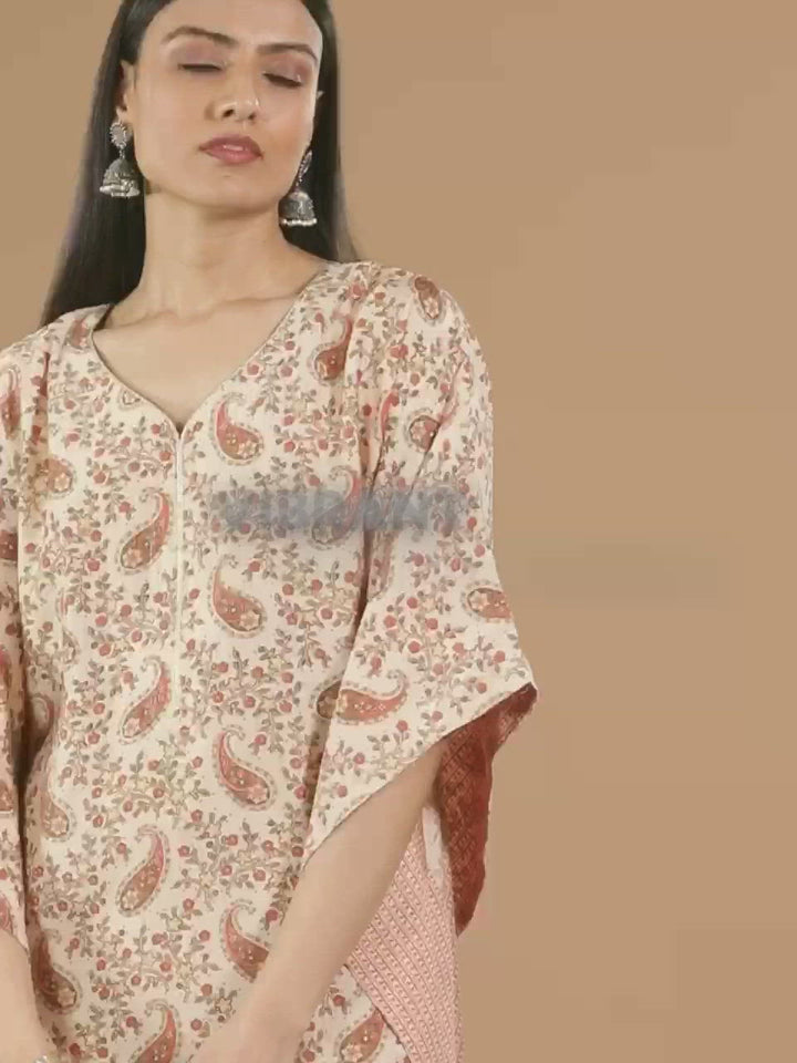 Beige Printed Silk Kaftan Dress