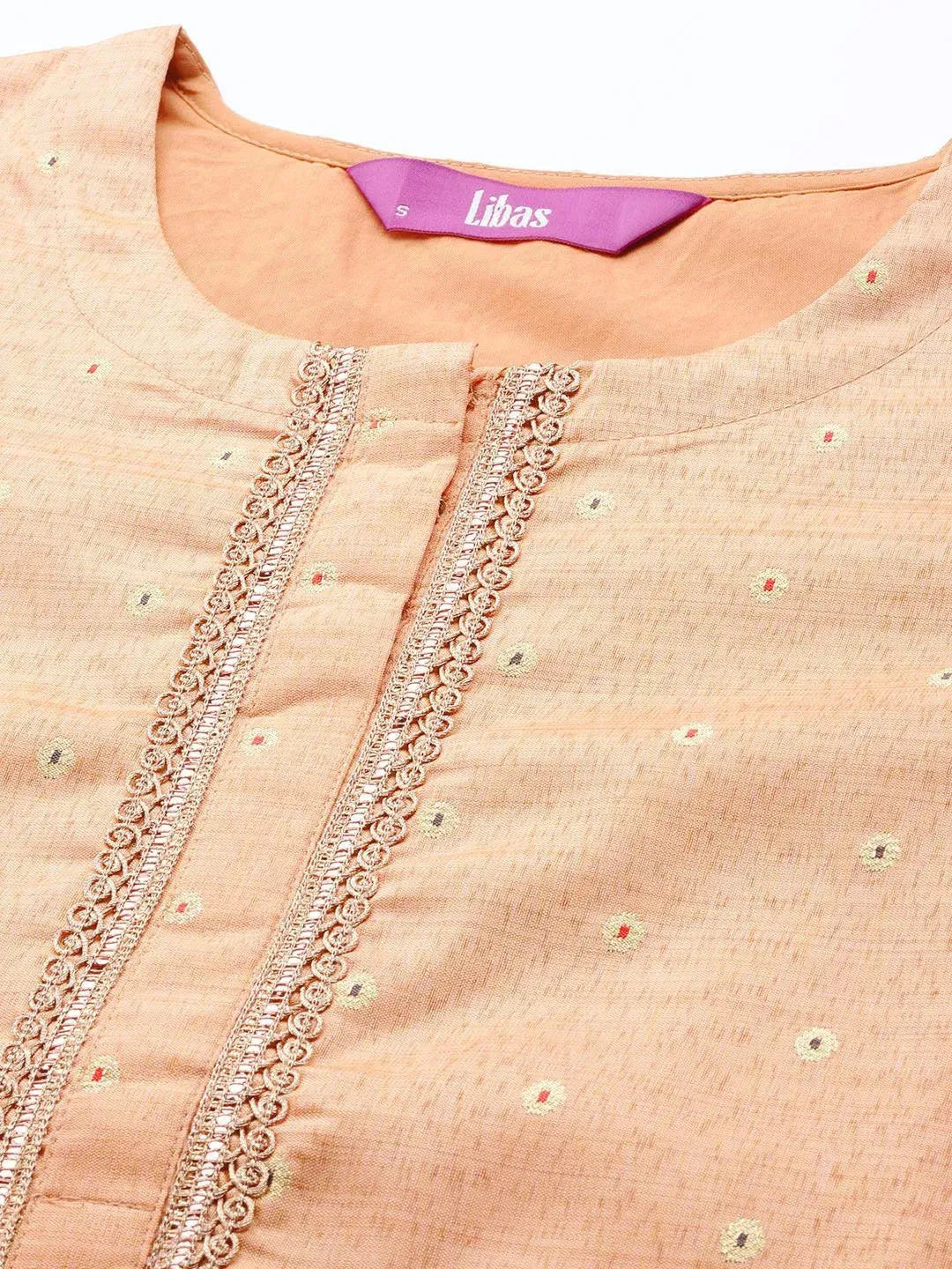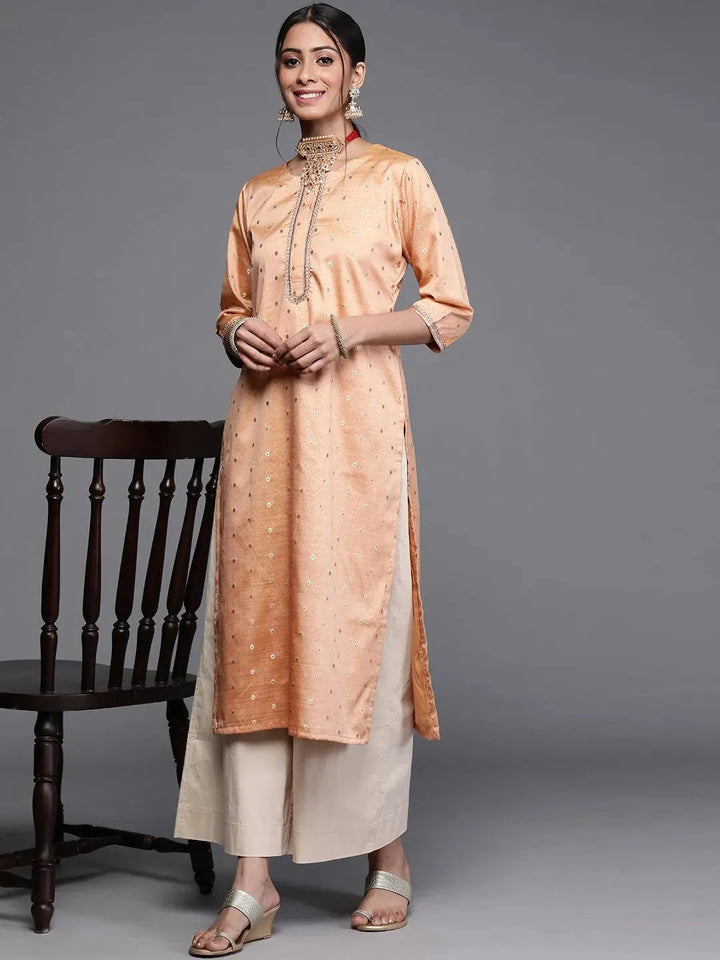 Our beige woven design straight-fit kurta, crafted in sumptuous Chanderi silk fabric features a round neckline, three-quarter sleeves, and a statement yoke. Adorned with delicate Gota Patti accents, this graceful style is ideal for light festivities.