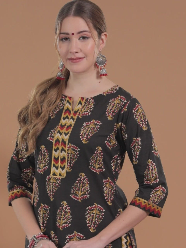 Our black cotton straight-fit kurta features ethnic motifs print, a notched neckline, and three-quarter regular sleeves. Adorned with fabric trim details, this graceful style is ideal for casual outings.