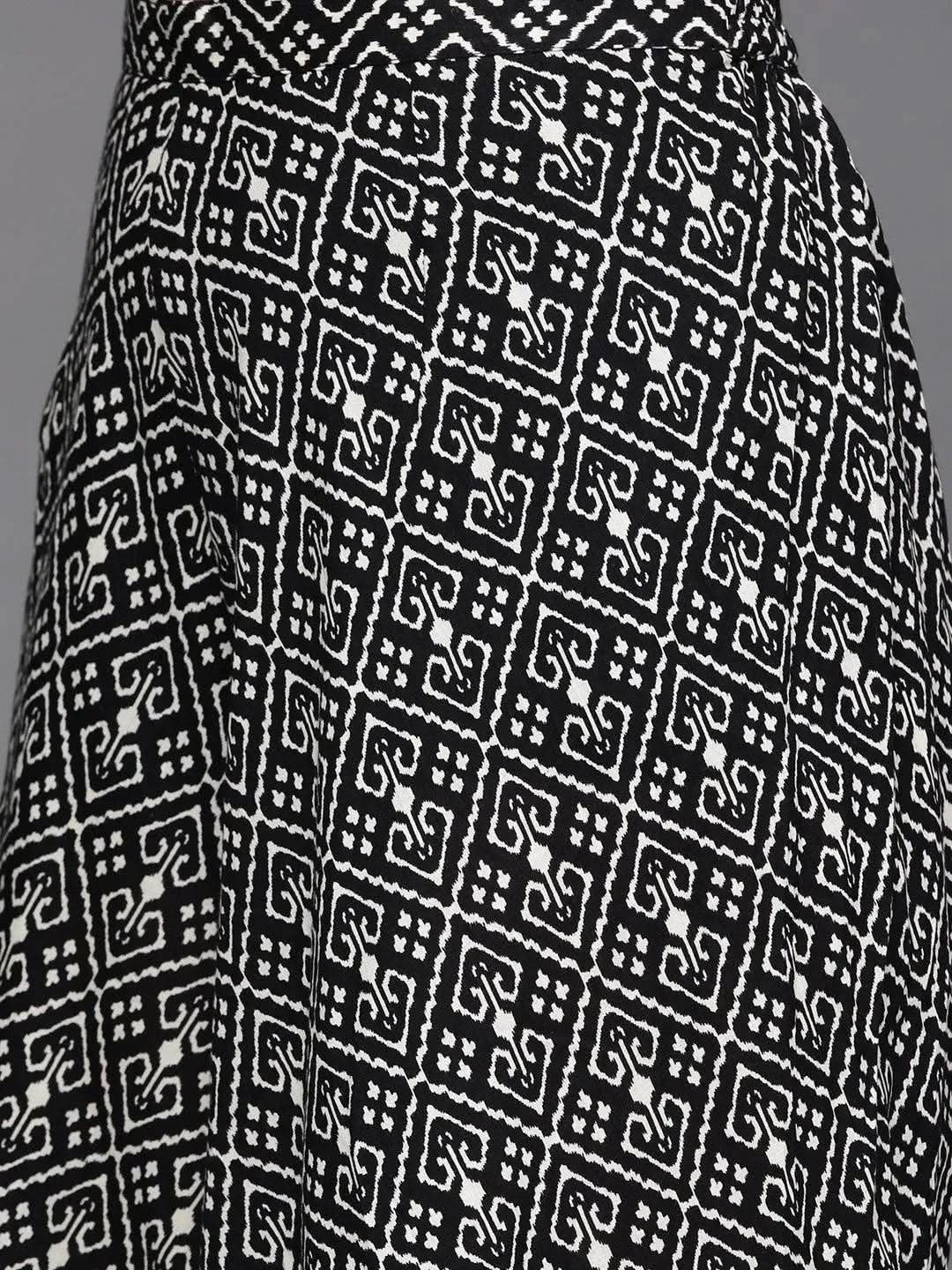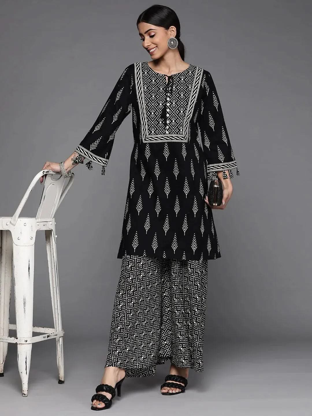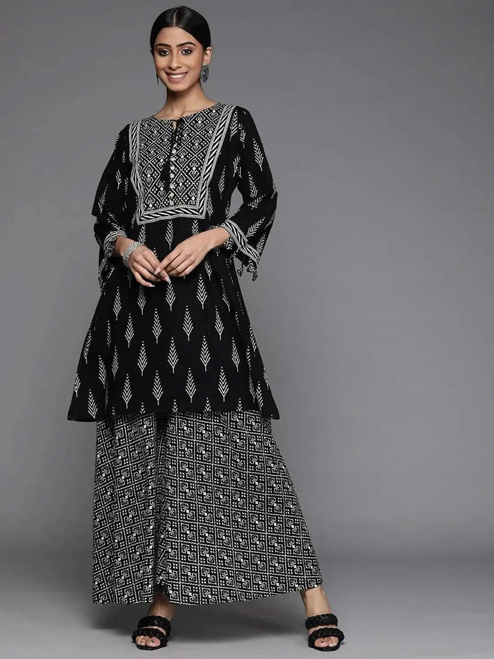 Our 2-piece black printed cotton suit set A-line short kurta with a round neckline and three-quarter flared sleeves. Complemented with palazzo pants with a partially elasticated waistband, and a dupatta in a matching design. Adorned with handcrafted dori and a statement yoke, this refreshing style is perfect for casual brunches.