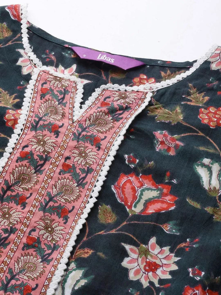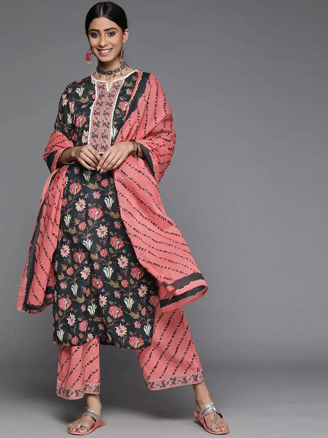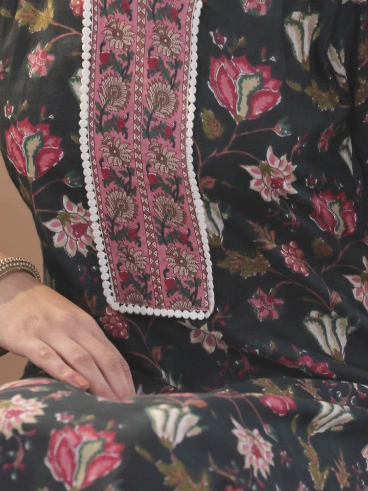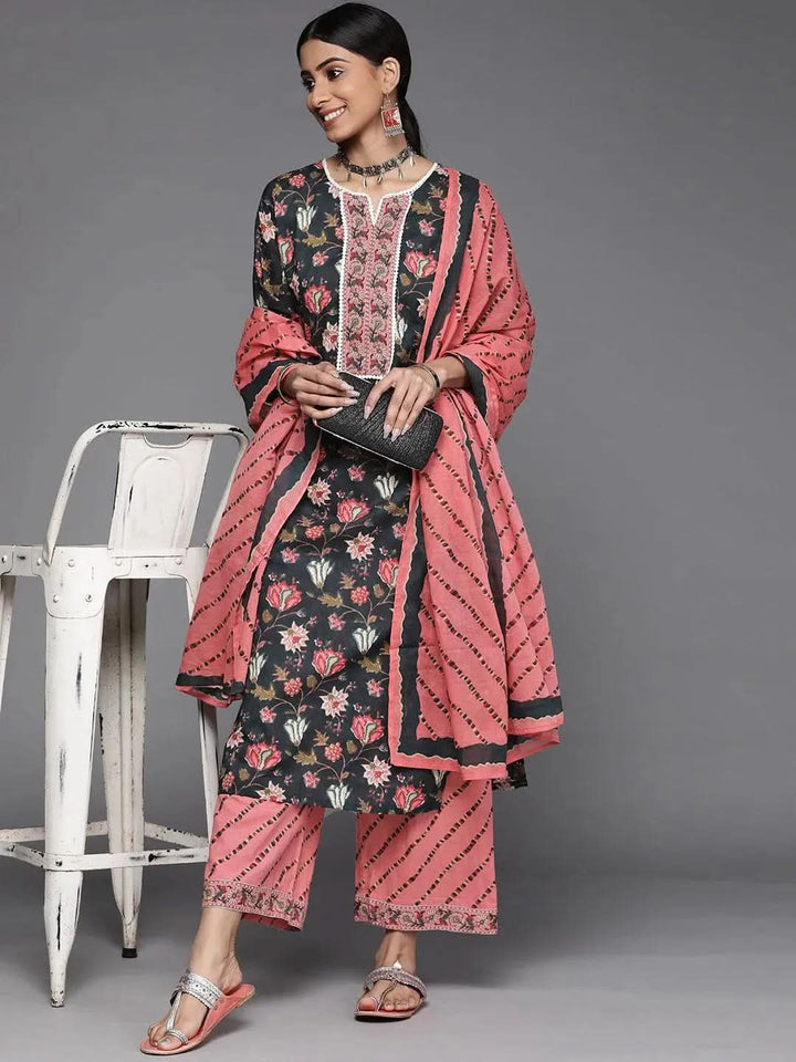 Our 3-piece black cotton suit set highlighted by a floral print features a straight-fit kurta with a notched neckline, straight pants with a partially elasticated waistband and roomy pockets, and a dupatta in a chevron printed style. Adorned with delicate fabric and lace-trim accents. This outfit is perfect for elevated everyday wear.
