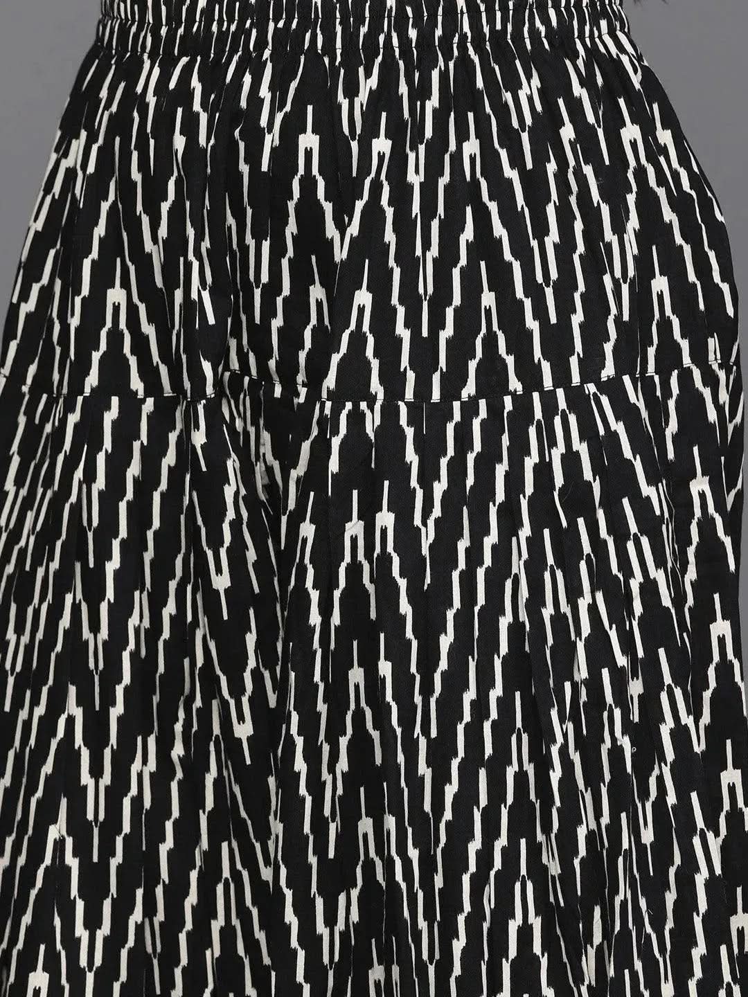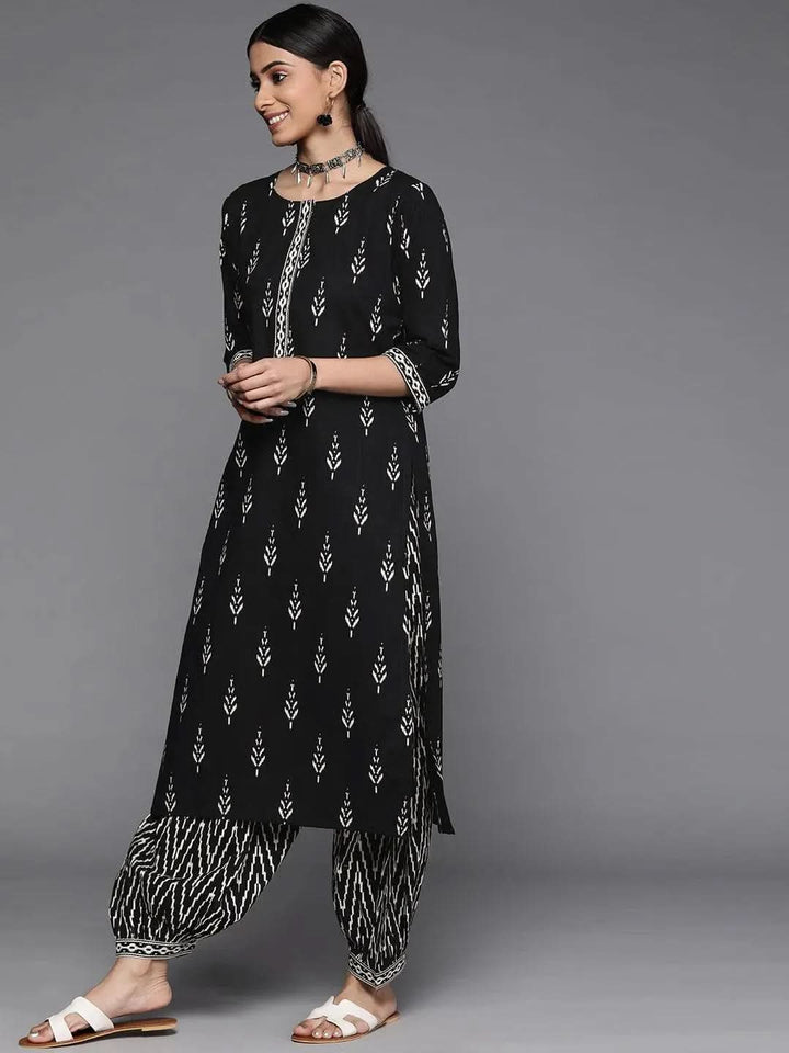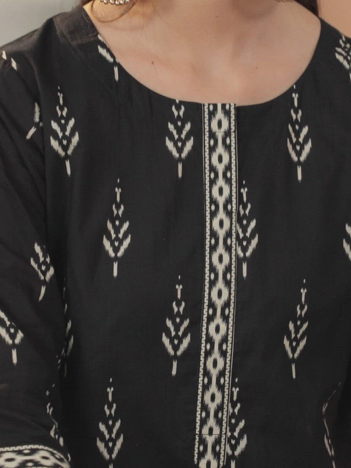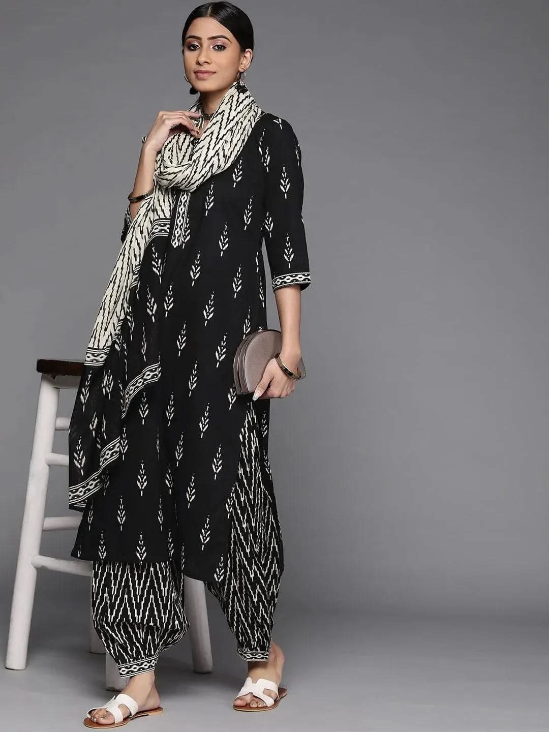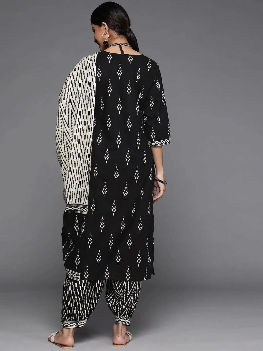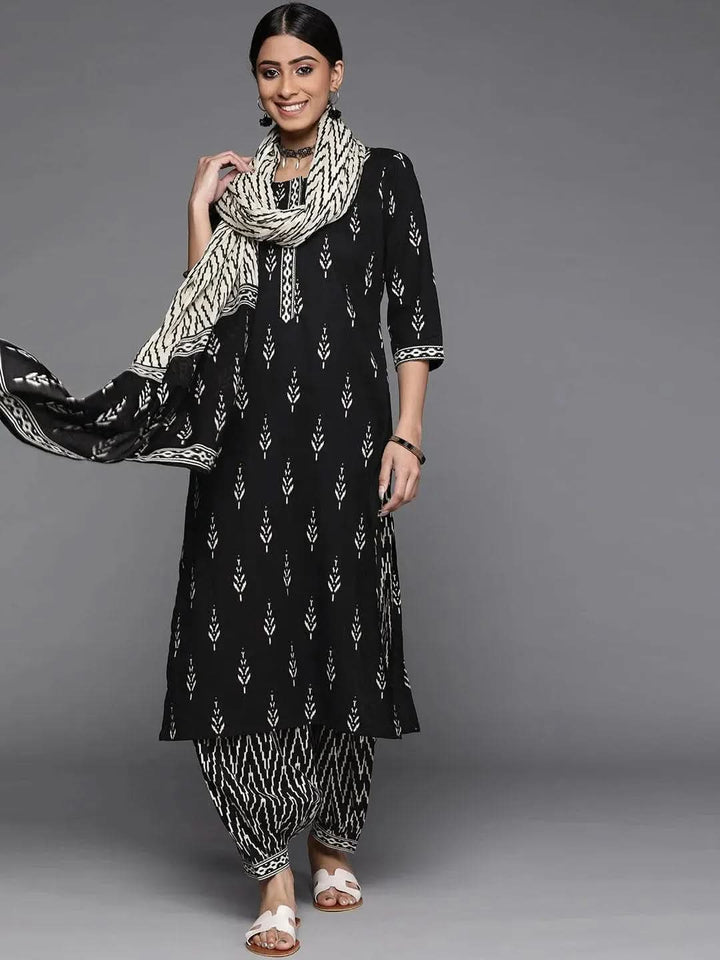 Black Printed Cotton Straight Kurta With Salwar & Dupatta