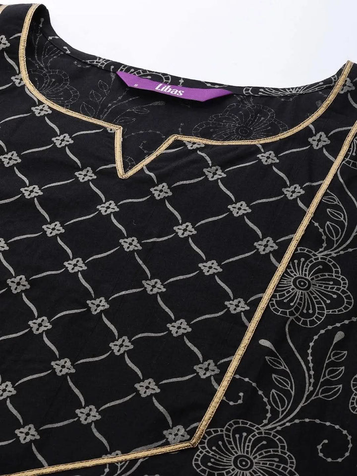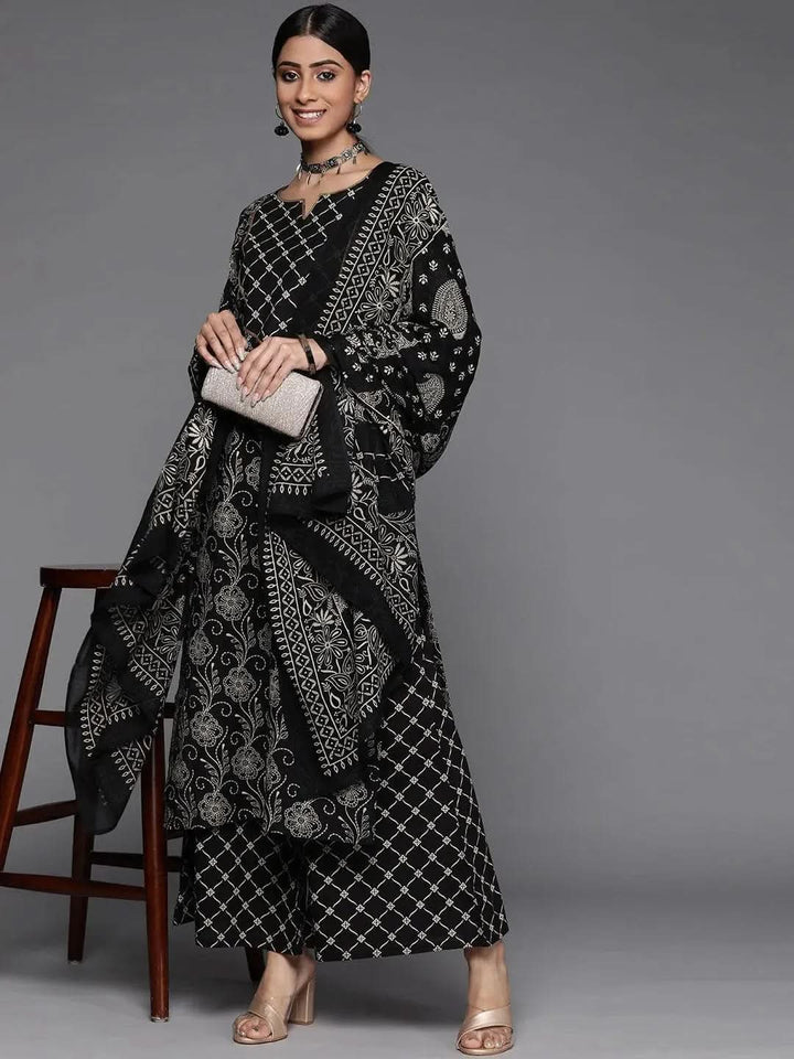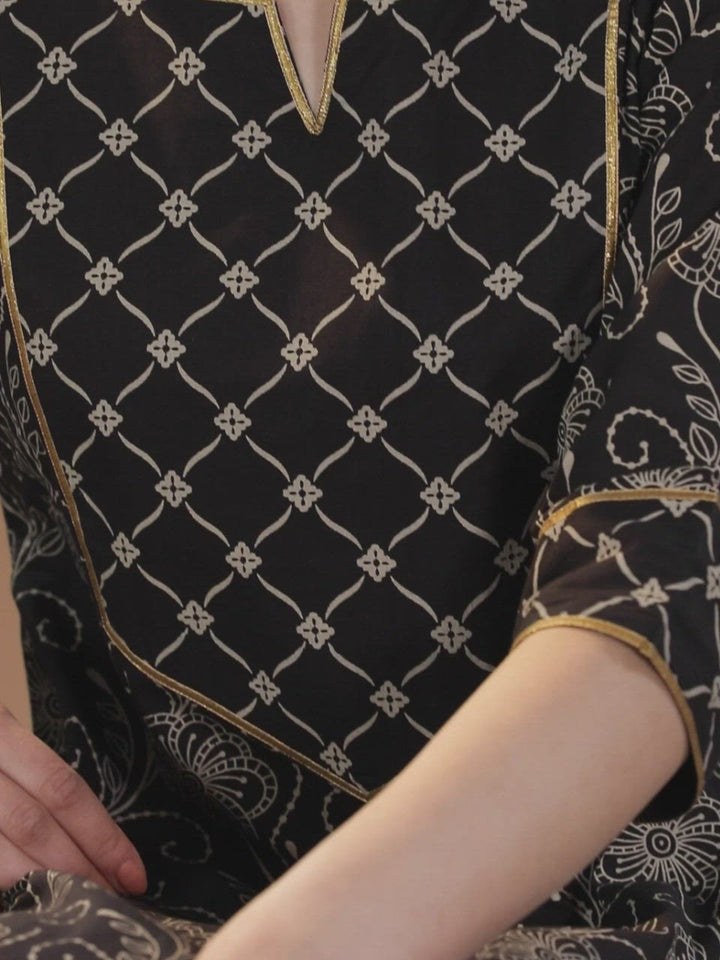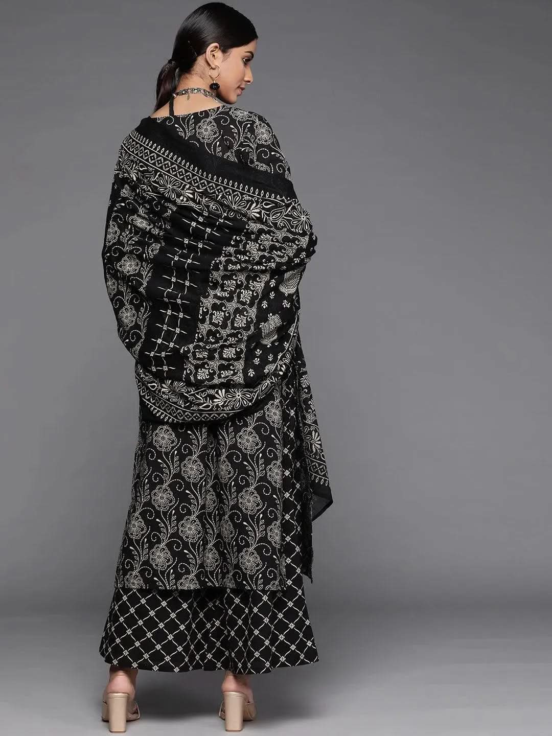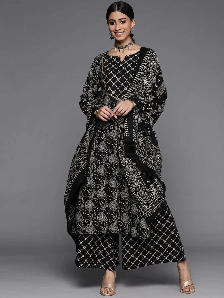 Black Printed Cotton Straight Kurta With Palazzos & Dupatta