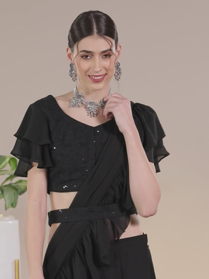 Our black solid saree, crafted in pure georgette fabric. Complemented with a stitched blouse with feminine frills. Elevated with elegant print and a matching potli, this graceful style is perfect for light festivities.
