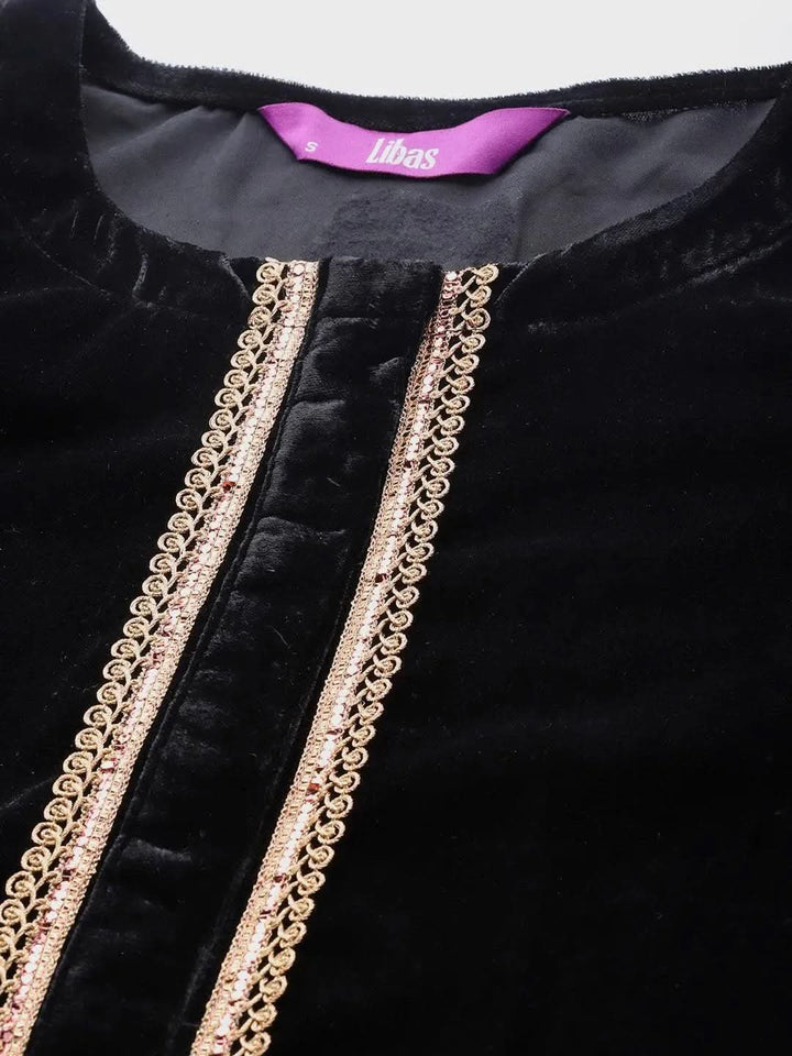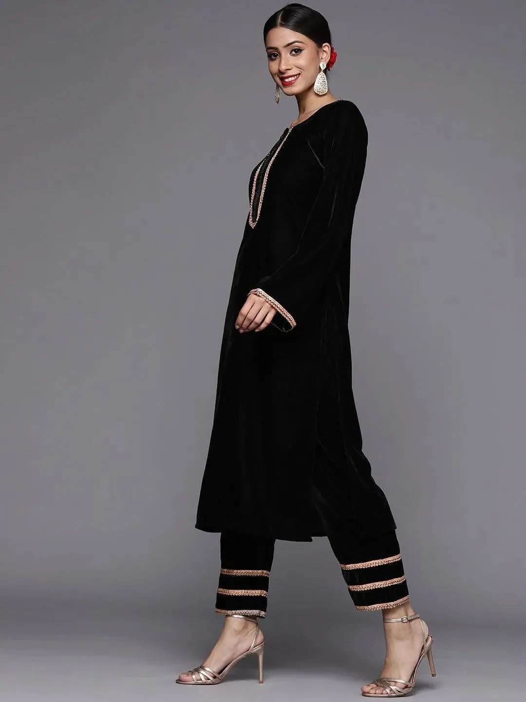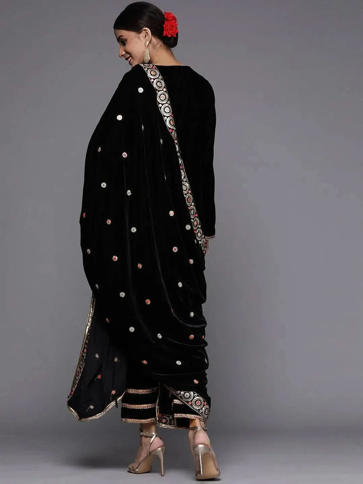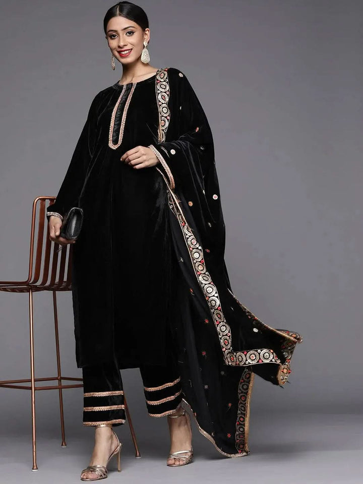 Black Solid Velvet Straight Kurta With Dupatta