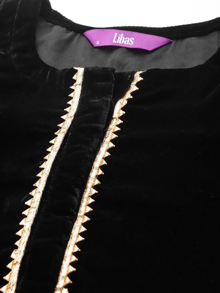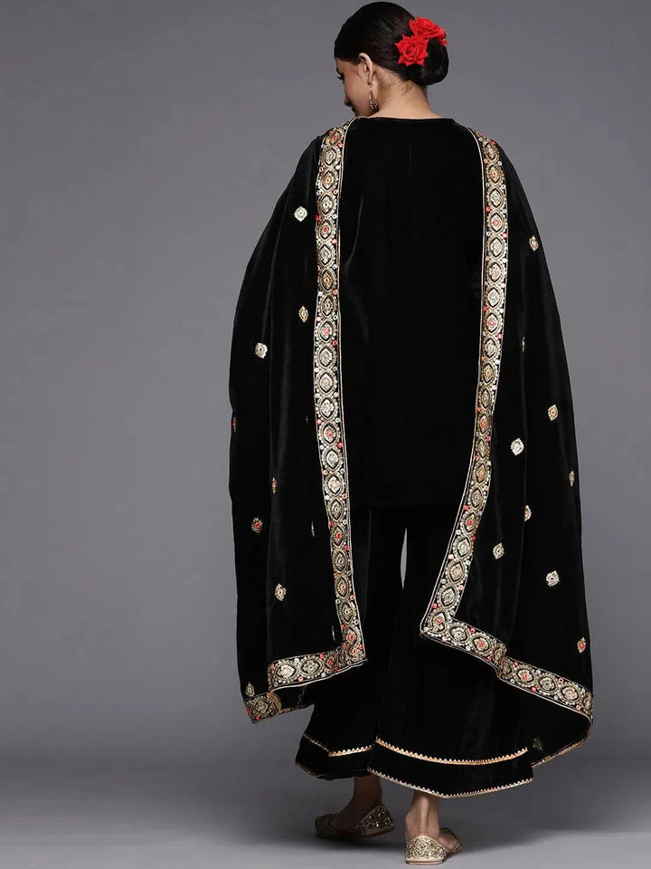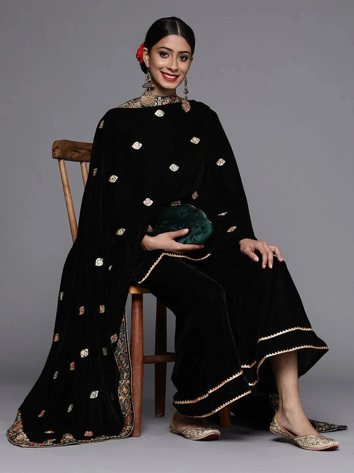 Black Solid Velvet Straight Kurta With Palazzos & Dupatta
