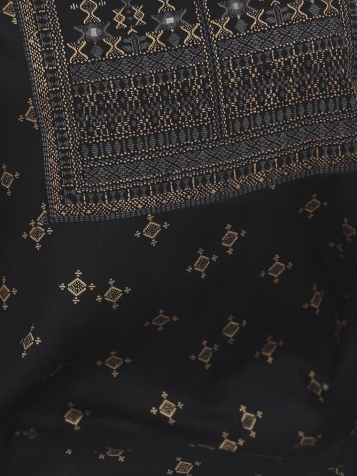 Our black A-line viscose rayon kurta features an embellished yoke design, a notched mandarin collar, and three-quarter sleeves. Adorned with mirror work details, this graceful style is perfect for daytime festivities.
