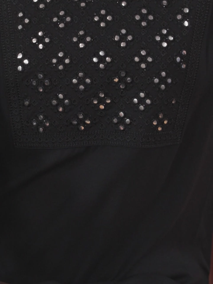 Our 3-piece black rayon suit set features a straight-fit kurta with a round neckline and three-quarter sleeves. Complemented with solid palazzo pants and a stylish dupatta. Adorned with Gota Patti detailing and mirror accents, this refreshing style is perfect for light festivities.