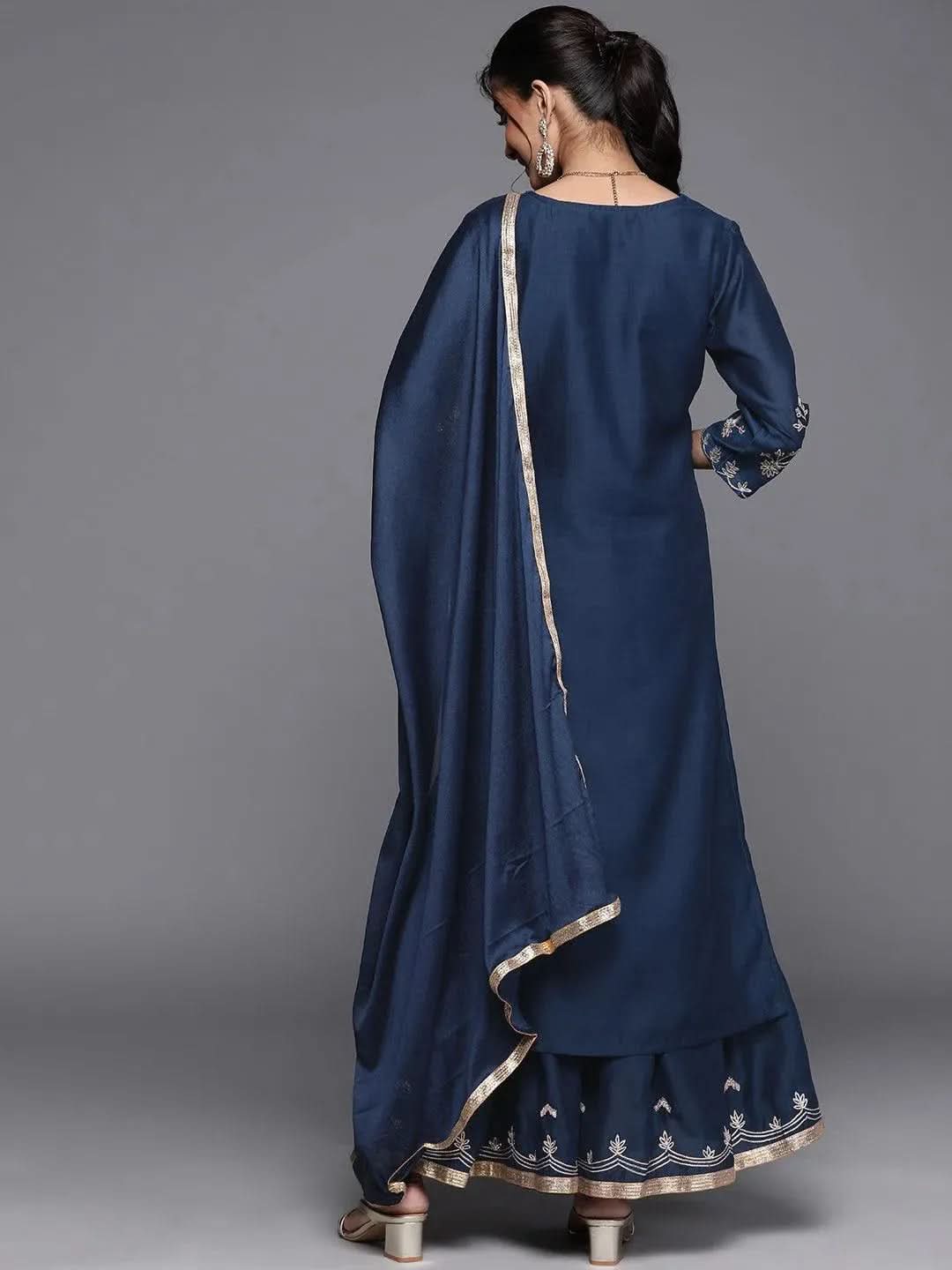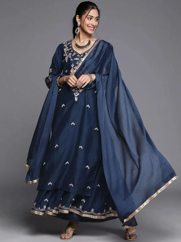 Blue Embroidered Chanderi Silk Straight Kurta With Sharara & Dupatta