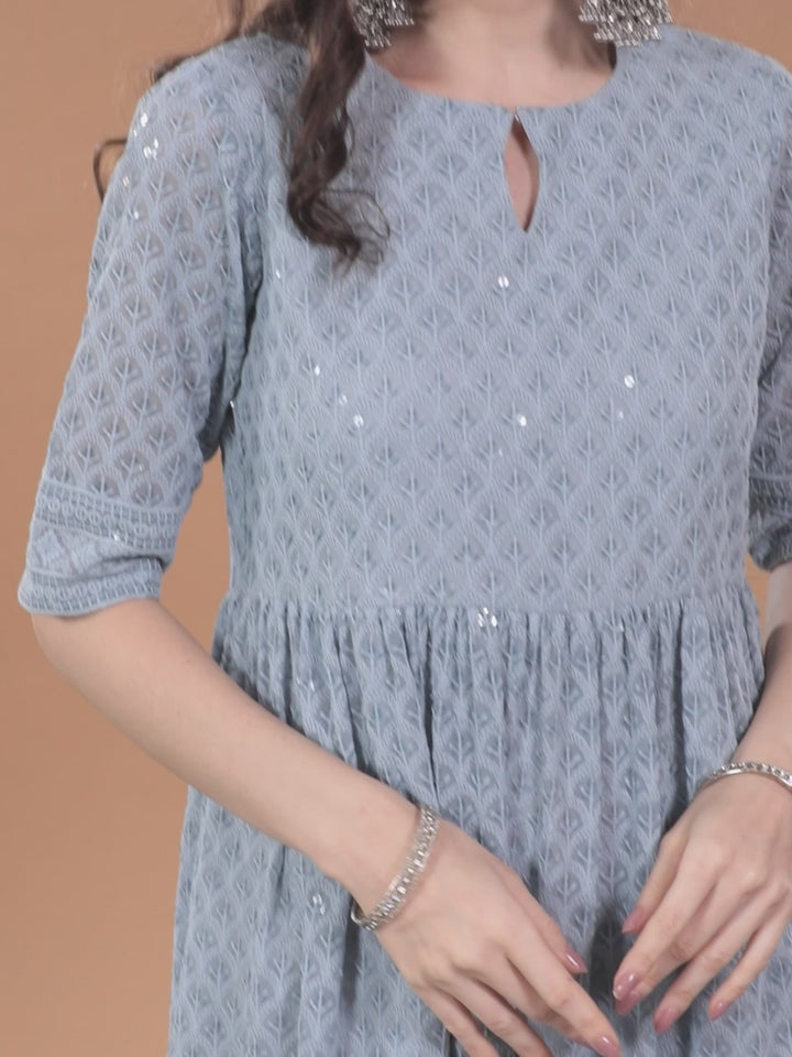 Our blue georgette dress features a keyhole neckline, three-quarter sleeves with embroidery detailing and a flared hemline. This stylish dress is ideal for daytime festivities.