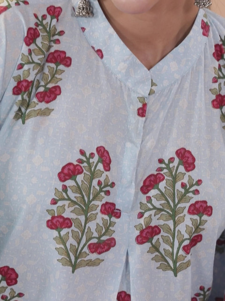 Our 2-piece blue cotton loungewear set features a floral print kurta with a mandarin collar and three-quarter sleeves. Complemented with printed straight slip-on pyjama pants with roomy pockets. Ideal for lounging or casual outings.