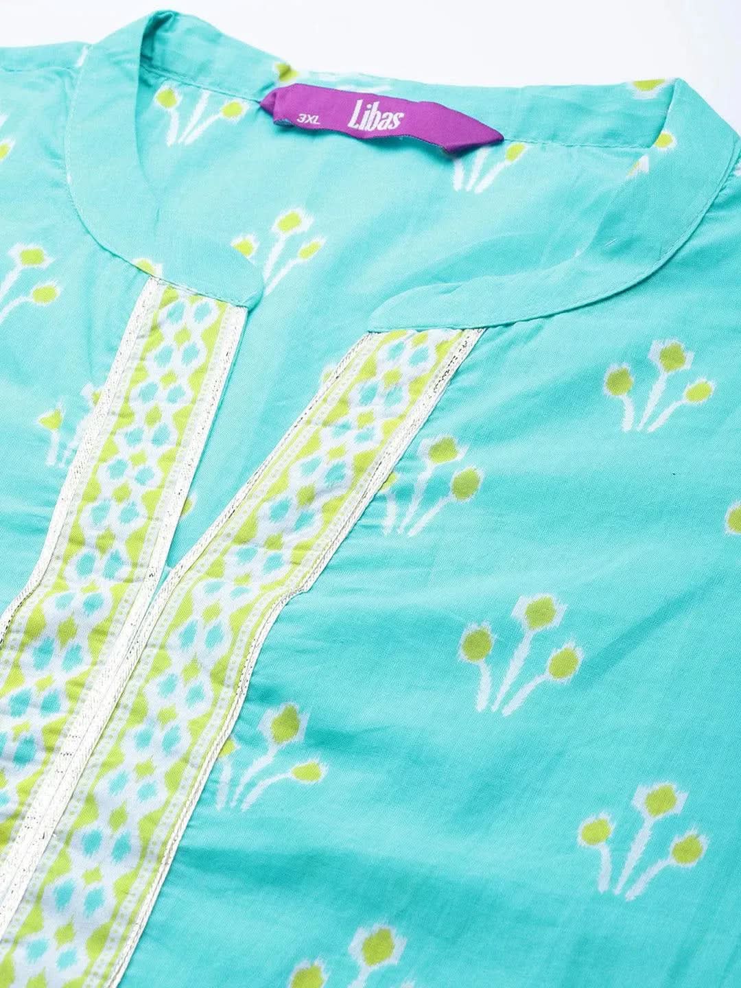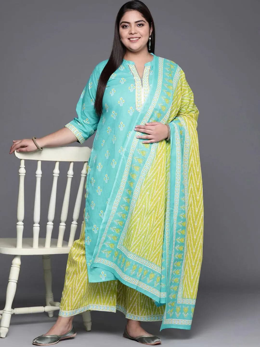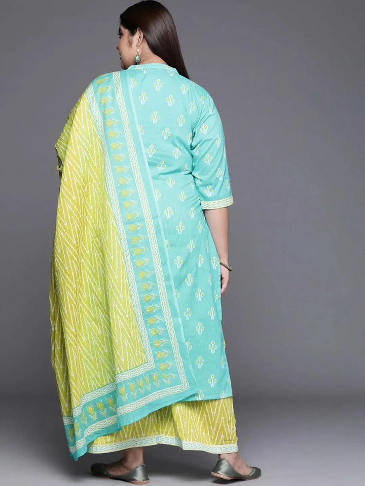 Plus Size Blue Printed Cotton Straight Kurta With Palazzos & Dupatta