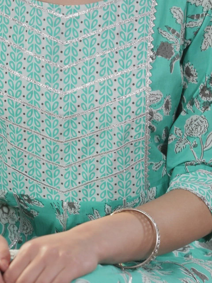 Our 3-piece blue printed cotton suit set highlighted with a floral print features an Anarkali kurta with a round neckline, straight pants with a partially elasticated waistband and roomy pockets, and a dupatta in a complementing print. Adorned with delicate Gota Patti accents, this style is perfect for light festivities.