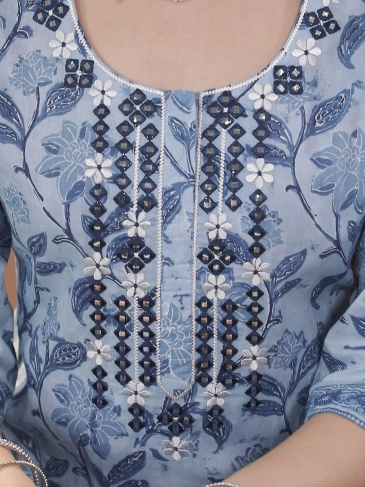 Our 3-piece blue cotton suit set highlighted with a floral print features a straight-fit kurta with a round neckline, straight pants with a partially elasticated waistband and roomy pockets, and a dupatta in a chevron print. This style is perfect for casual outings.
