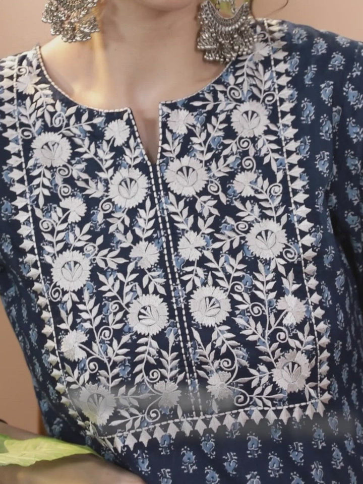 Our 3-piece blue cotton suit set highlighted with a floral print features a straight-fit kurta with a round neckline, straight pants with a partially elasticated waistband and roomy pockets, and a dupatta in a contrasting print. Adorned with mirror-work detailing, this style is perfect for daytime festivities.