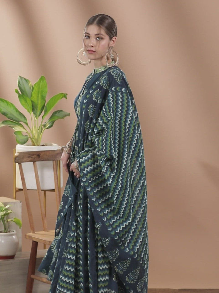 Our 3-piece blue cotton suit set highlighted with a paisley print features an A-line kurta with a mandarin neckline and flared sleeves, a straight palazzo with a partially elasticated waistband and roomy pockets, and a dupatta in a chevron print. Adorned with mirror-work, handcrafted dori details. This style is perfect for festivities.
