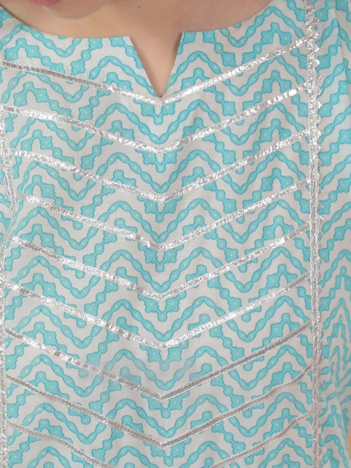 Our 3-piece blue cotton suit set highlighted with a floral print features an Anarkali kurta with a notched neckline, straight pants with a partially elasticated waistband and roomy pockets, and a dupatta in a chevron print. Adorned with statement yoke, Gota Patti detailing and fabric-trim accents. This style is perfect for light festivities.