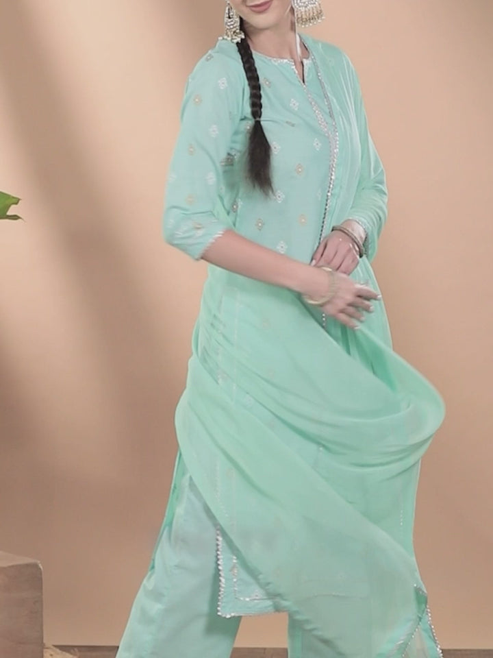 Our 3-piece blue cotton suit set features a straight-fit kurta with a notched neckline, straight pants with a partially elasticated waistband and roomy pockets, and a dupatta in a complementing style. Adorned with Gota Patti accents. This style is perfect for light festivities.