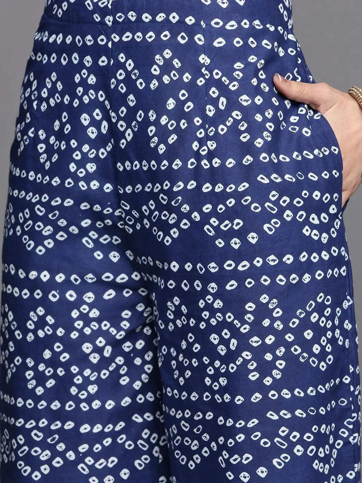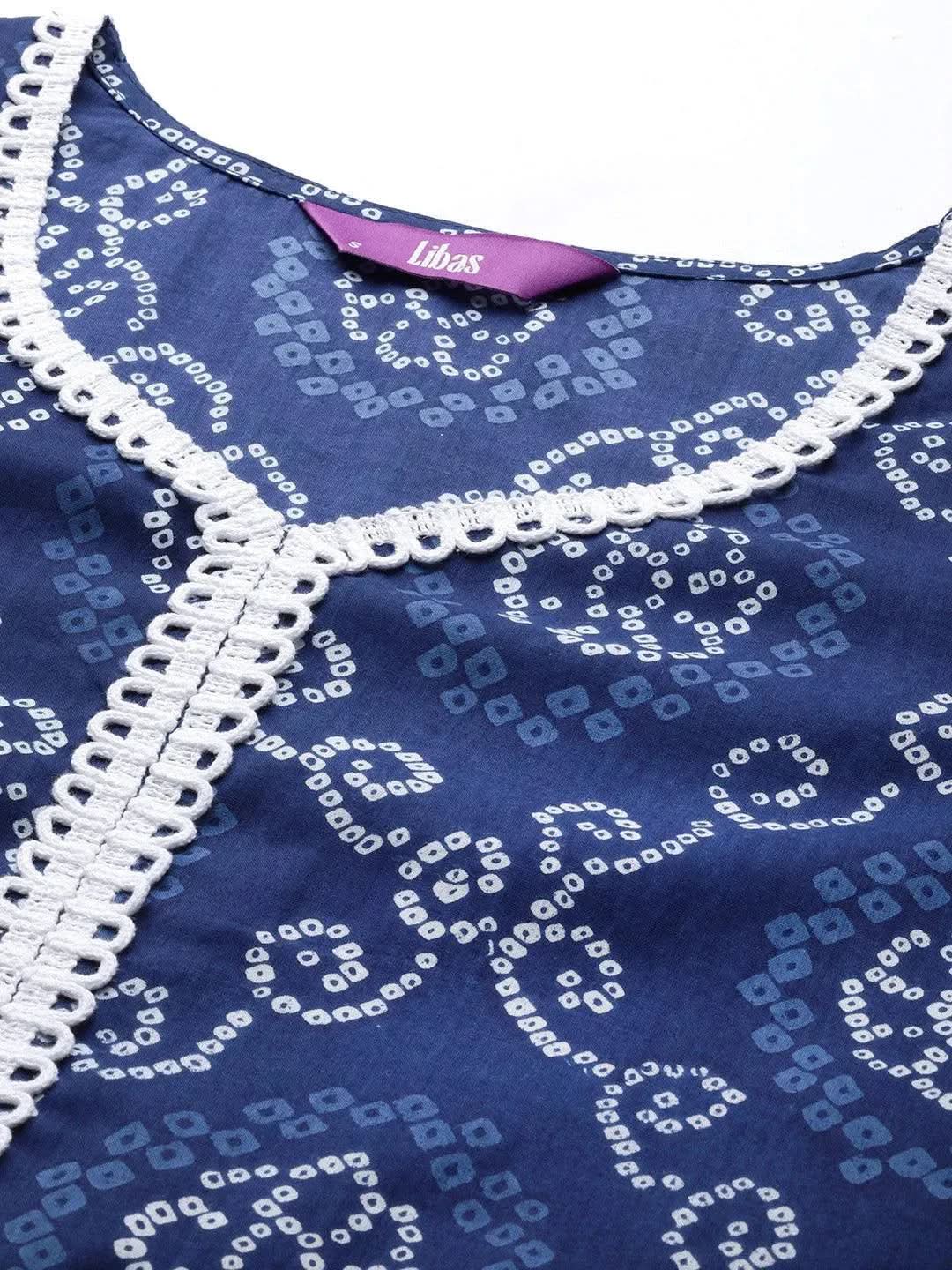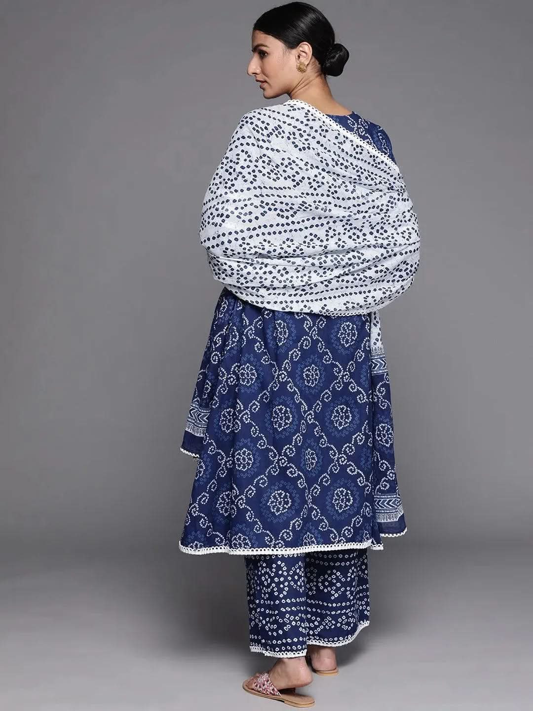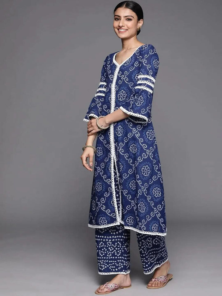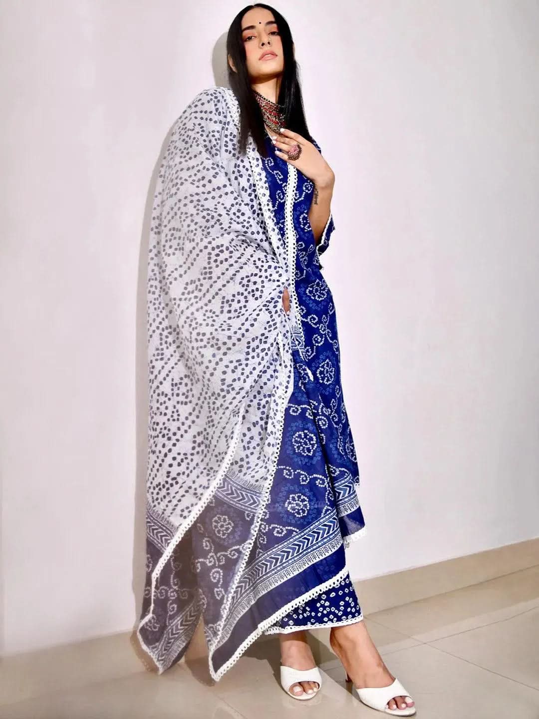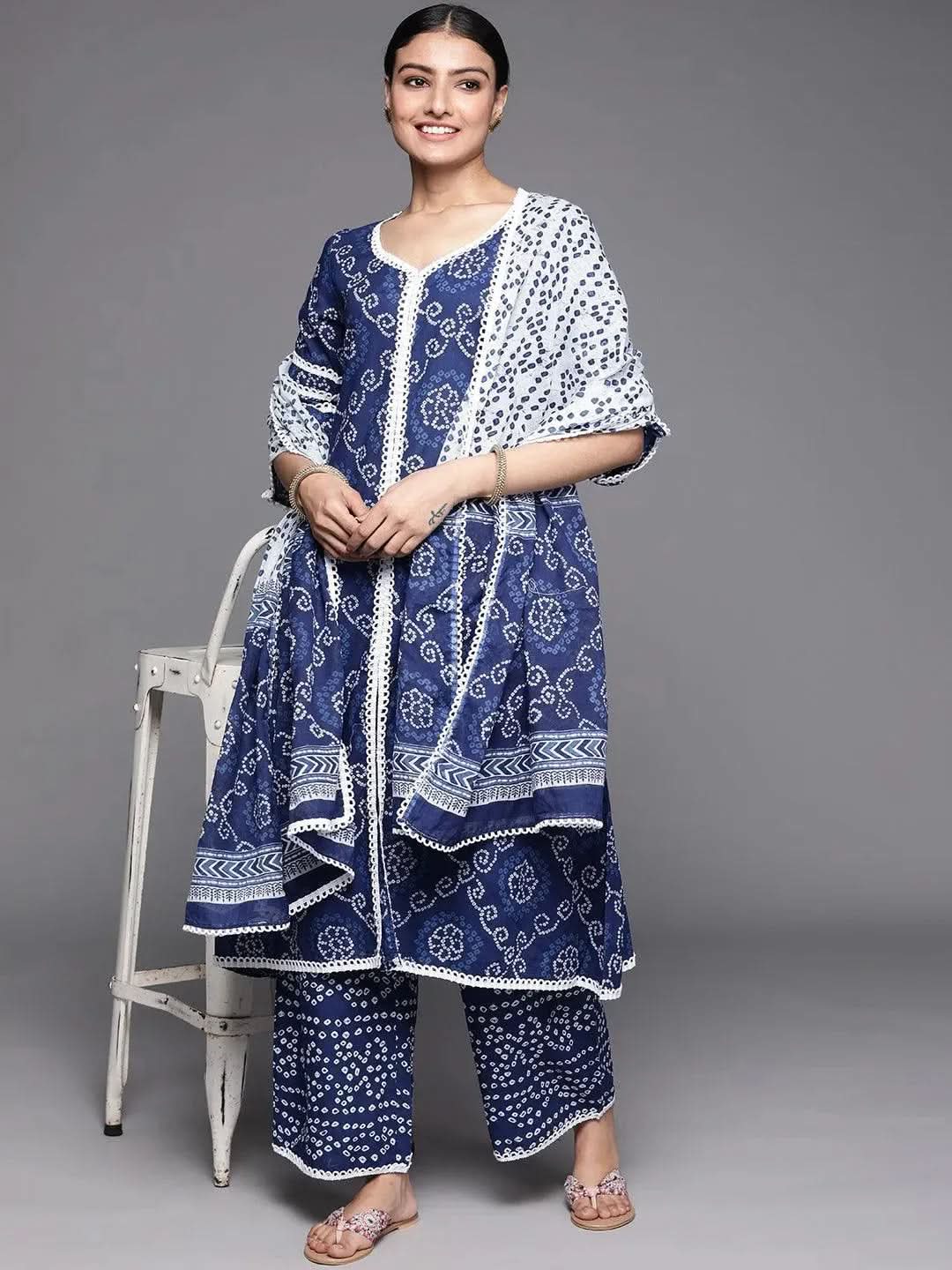 Our 3-piece blue cotton suit set features Bandhani inspired print A-line kurta with a V-neckline and three-quarter sleeves. Complemented with a palazzo pant with a partially elasticated waist, and a dupatta in a complementing print. Adorned with lace-trim detailing, this refreshing style is perfect for daytime festivities.