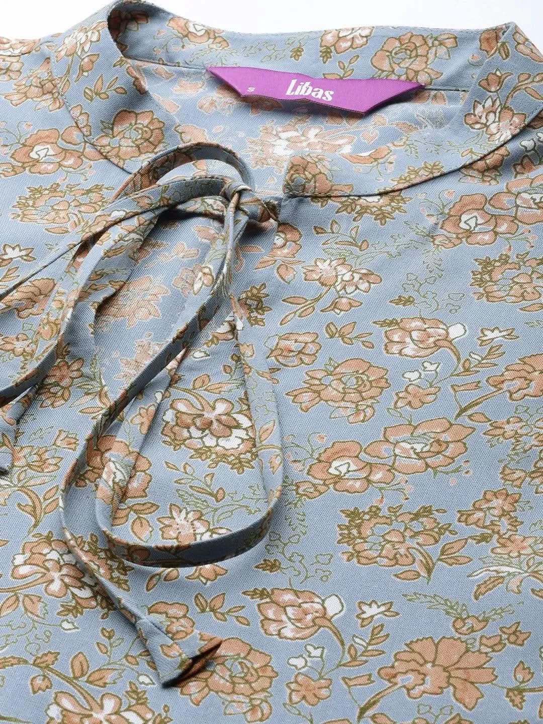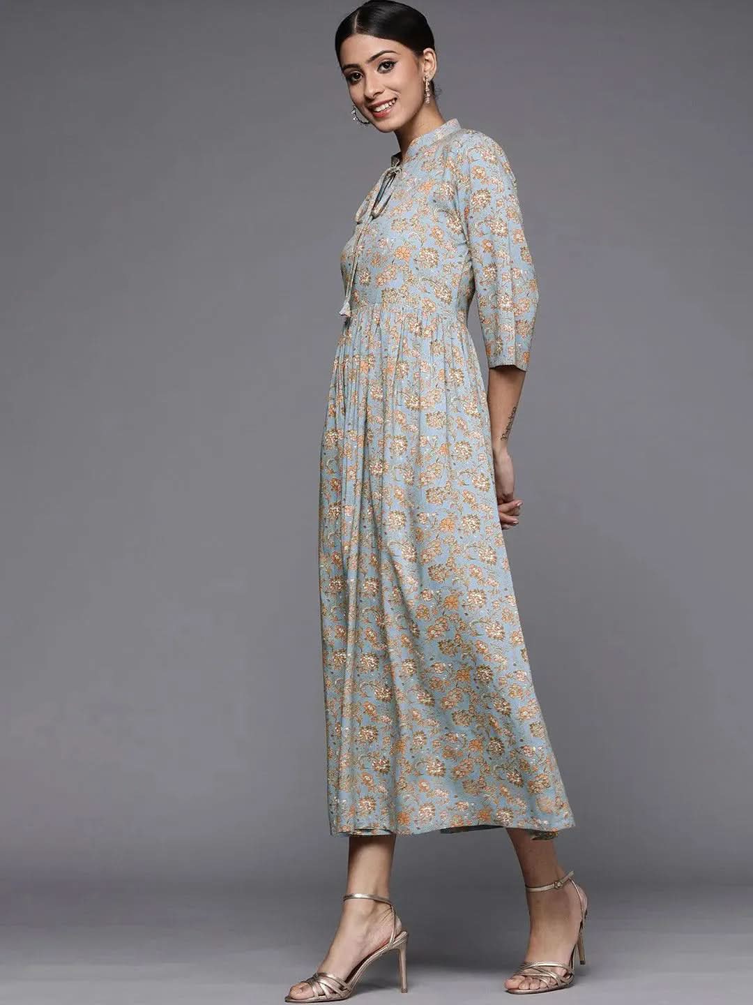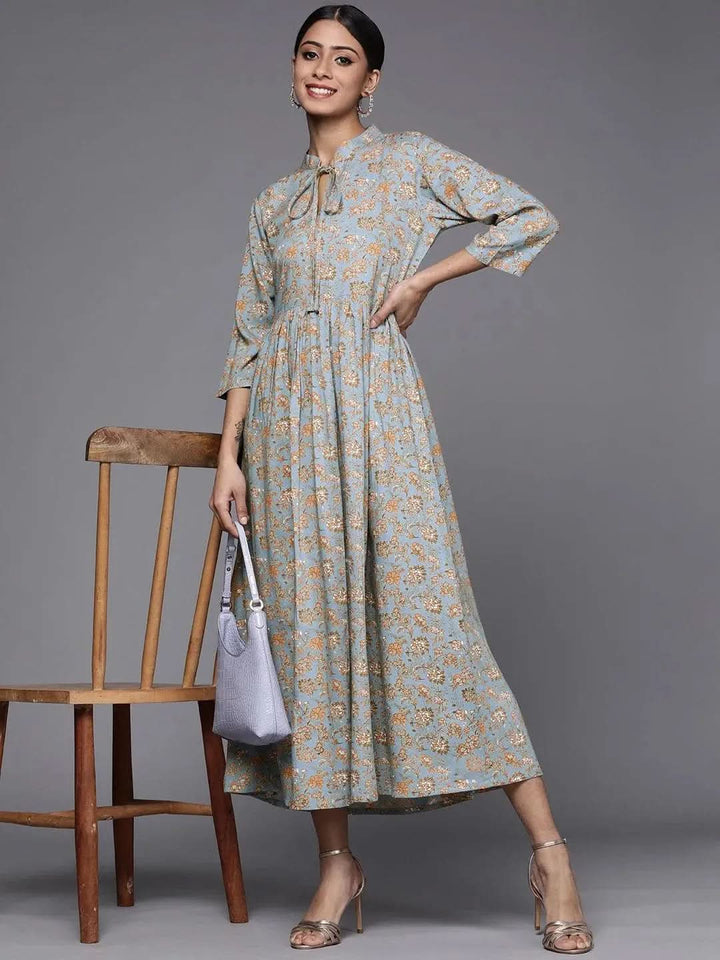 Our blue and mustard yellow floral print A-line viscose rayon dress, elevated with a tie-up neck, three-quarter, regular sleeves, pleated detailing and flared hem, is ideal for work and beyond.