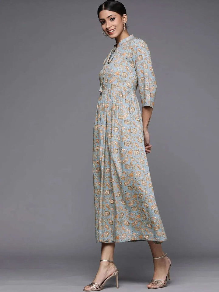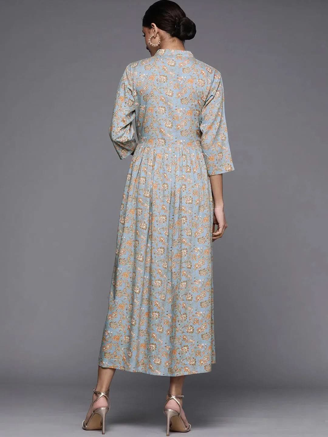 Blue Printed Rayon Maxi Dress