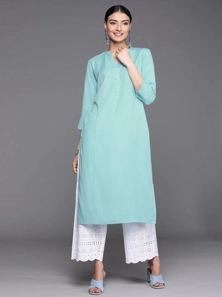Our blue straight-fit cotton kurta features a notched neckline, three-quarter sleeves and roomy pockets. This elegant style is ideal for casual outings.