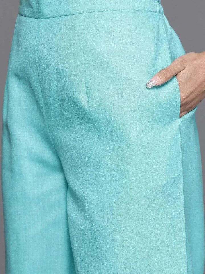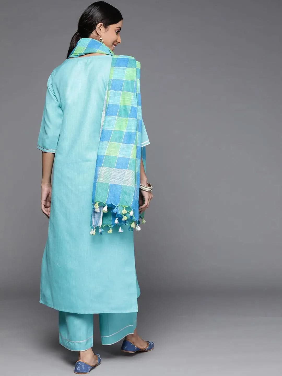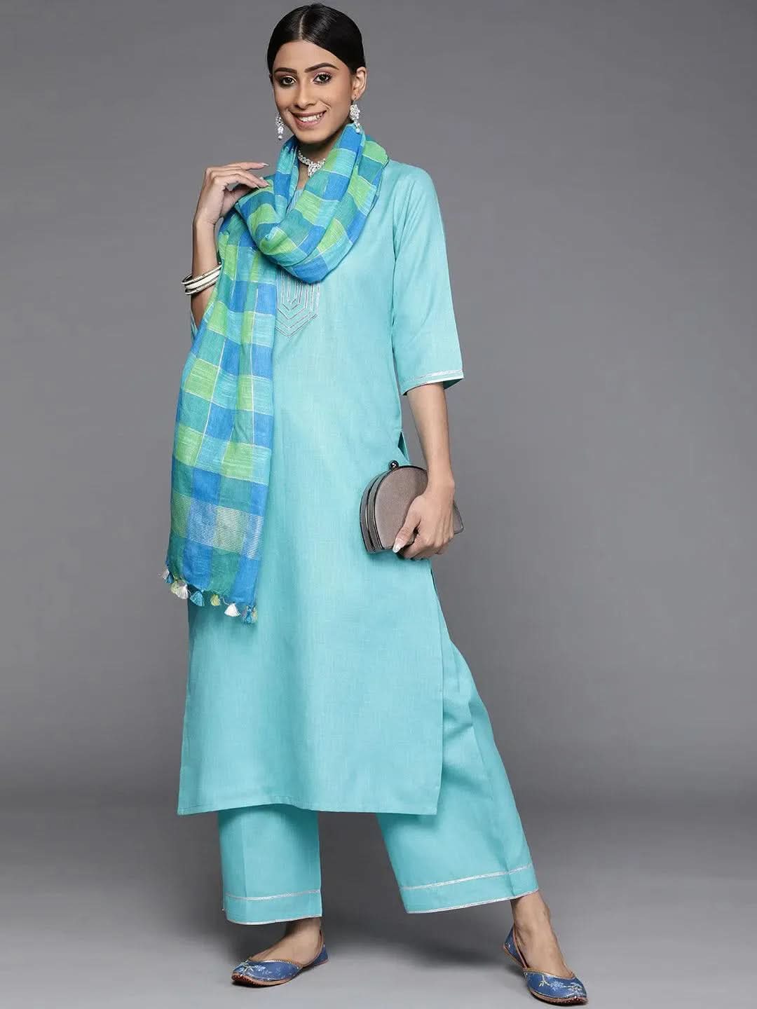 Blue Solid Cotton Straight Kurta With Palazzos & Dupatta