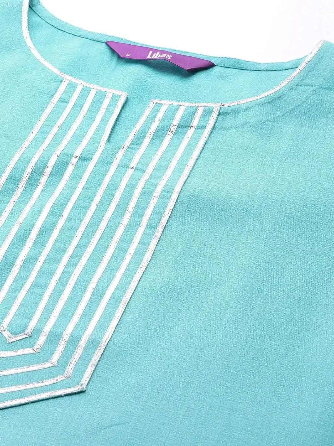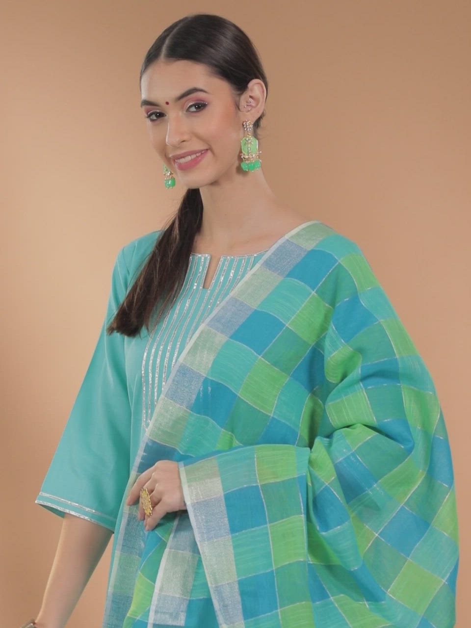 Our 3-piece blue cotton suit set features a straight-fit kurta with a notched neckline, straight pants with a partially elasticated waistband and roomy pockets, and a dupatta in a contrasting print. Adorned with delicate Gota Patti accents, this style is perfect for light festivities.