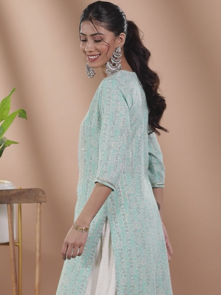 Our blue viscose rayon straight-fit kurta features a floral yoke design, a round neck, and three-quarter regular sleeves. This style is perfect for light festivities.