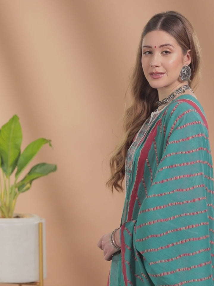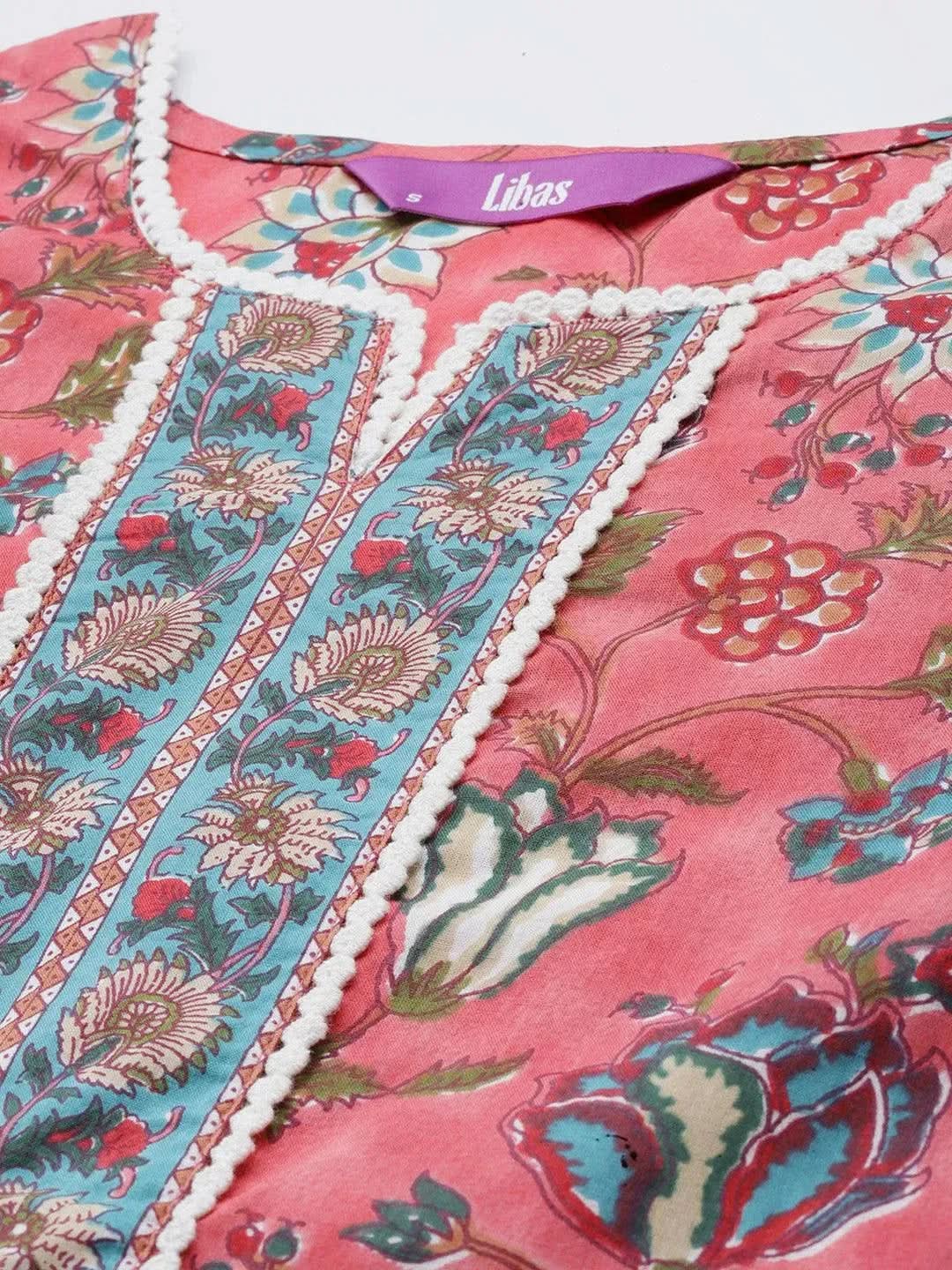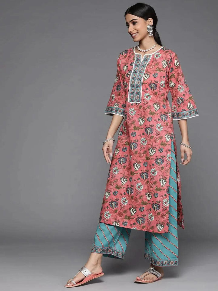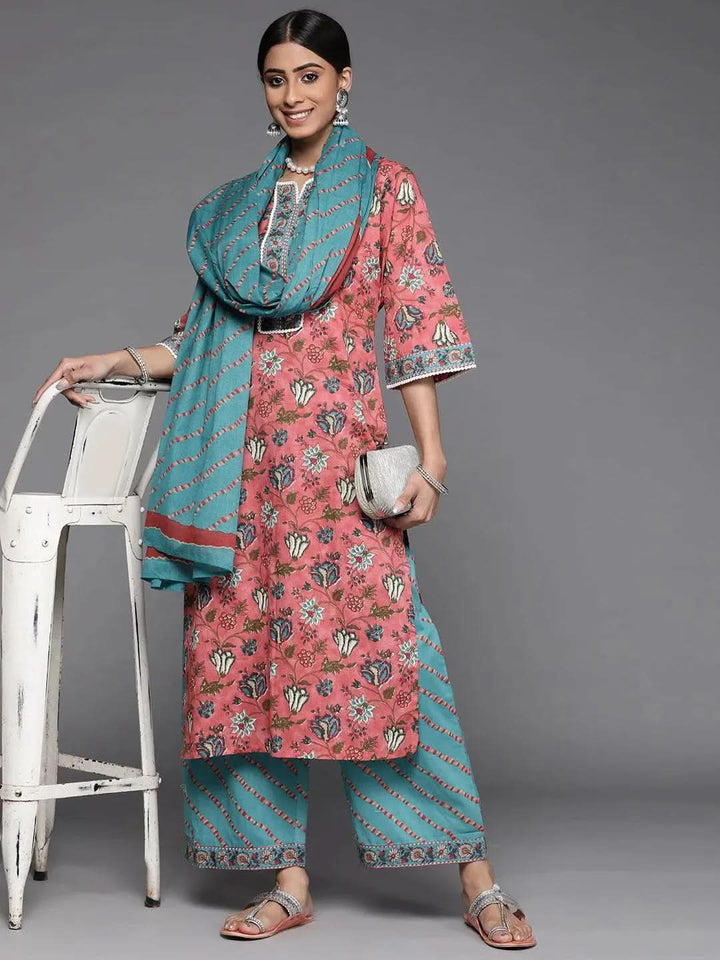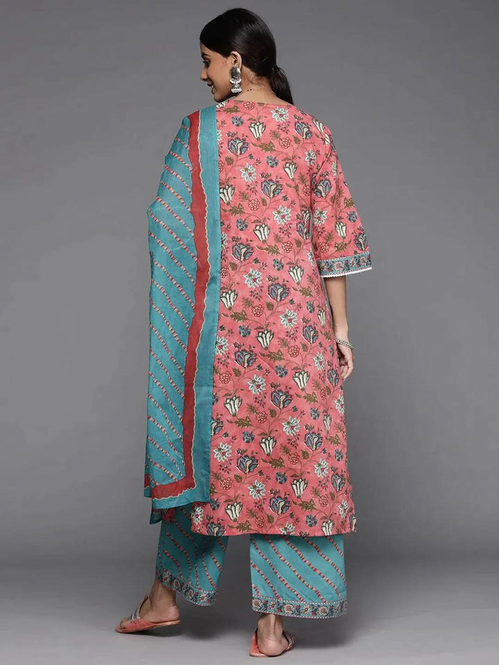 Coral Printed Cotton Straight Kurta With Palazzos & Dupatta