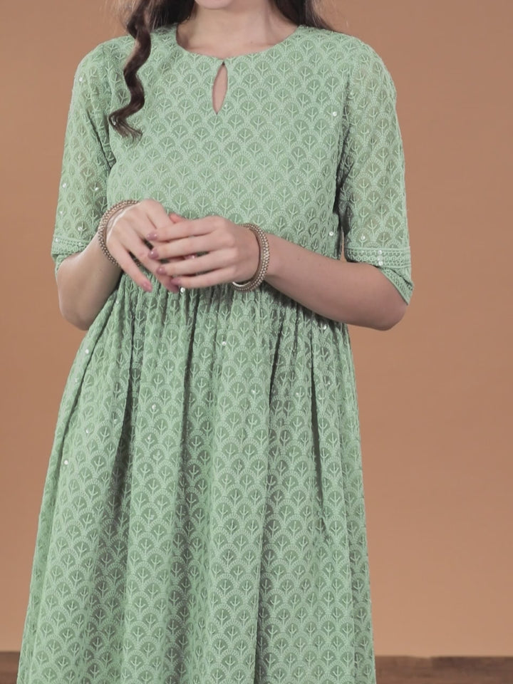 Our green georgette dress features a keyhole neckline, three-quarter sleeves with thread-work detailing and a flared hemline. This stylish dress is ideal for attending parties.