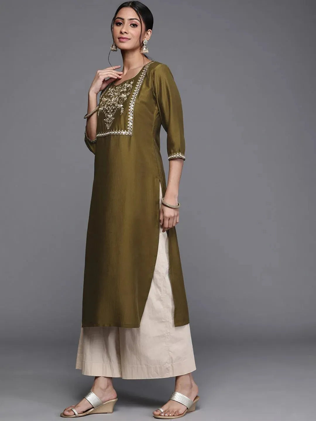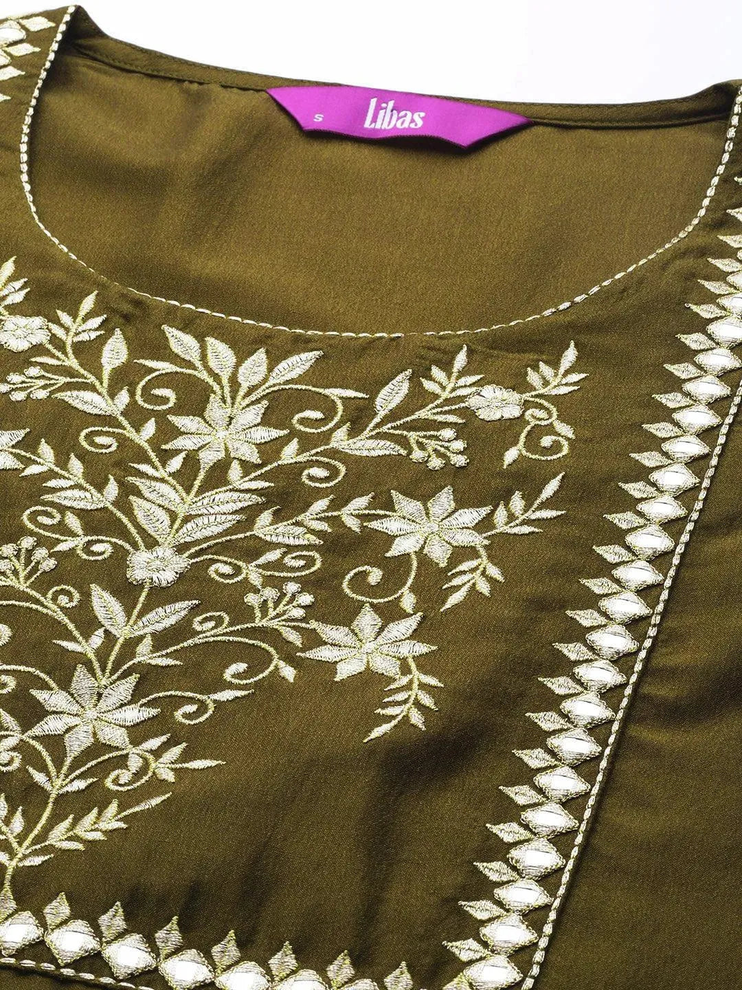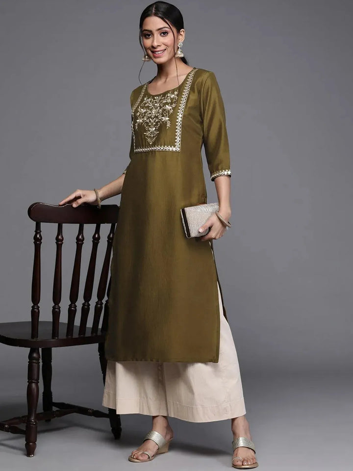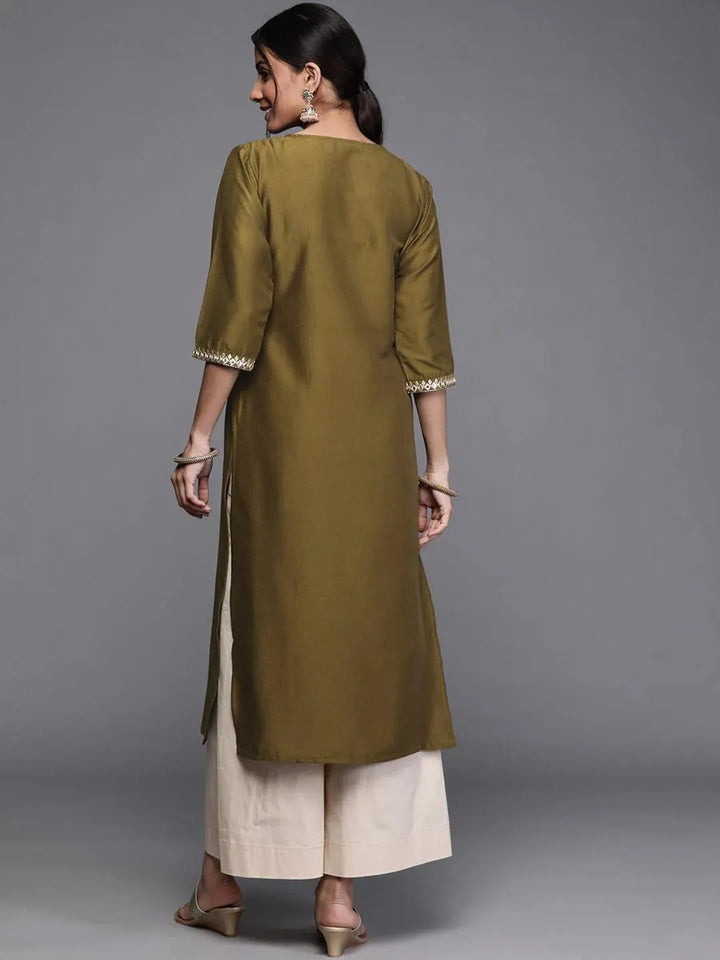 Our green and gold-toned straight-fit Chanderi silk kurta features floral embroidery, a round neck and three-quarter sleeves. Adorned with Gota Patti accents, this style is ideal for festive celebrations.