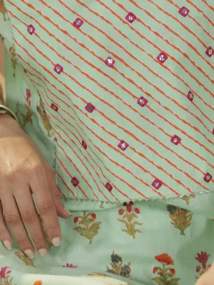 Our green and pink cotton straight-fit kurta features ethnic motifs print, a notched neckline, and three-quarter regular sleeves. Adorned with Gota Patti details, this refreshing style is ideal for daytime festivities.