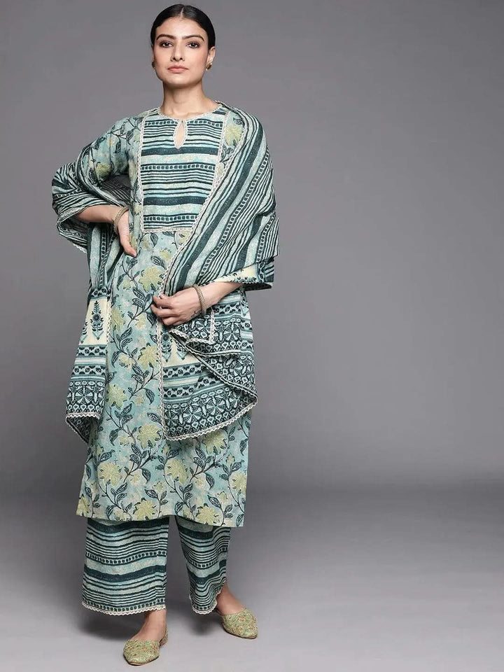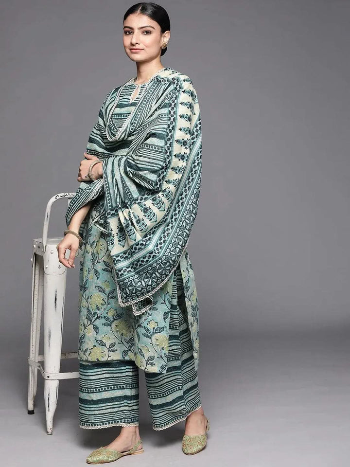 Green Printed Cotton Straight Kurta With Palazzos & Dupatta