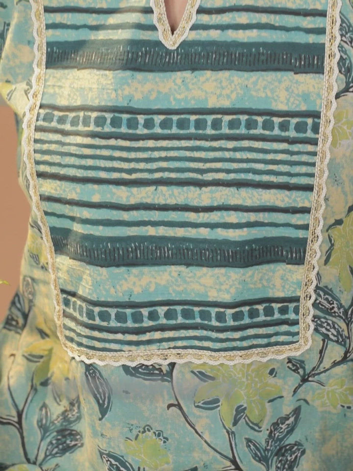 Our 3-piece green printed cotton suit set highlighted with a floral print features a straight-fit kurta with a keyhole neckline, straight pants with a partially elasticated waistband and roomy pockets, and a dupatta in a complementing print. Adorned with delicate lace trim accents, this style is perfect for daytime festivities.