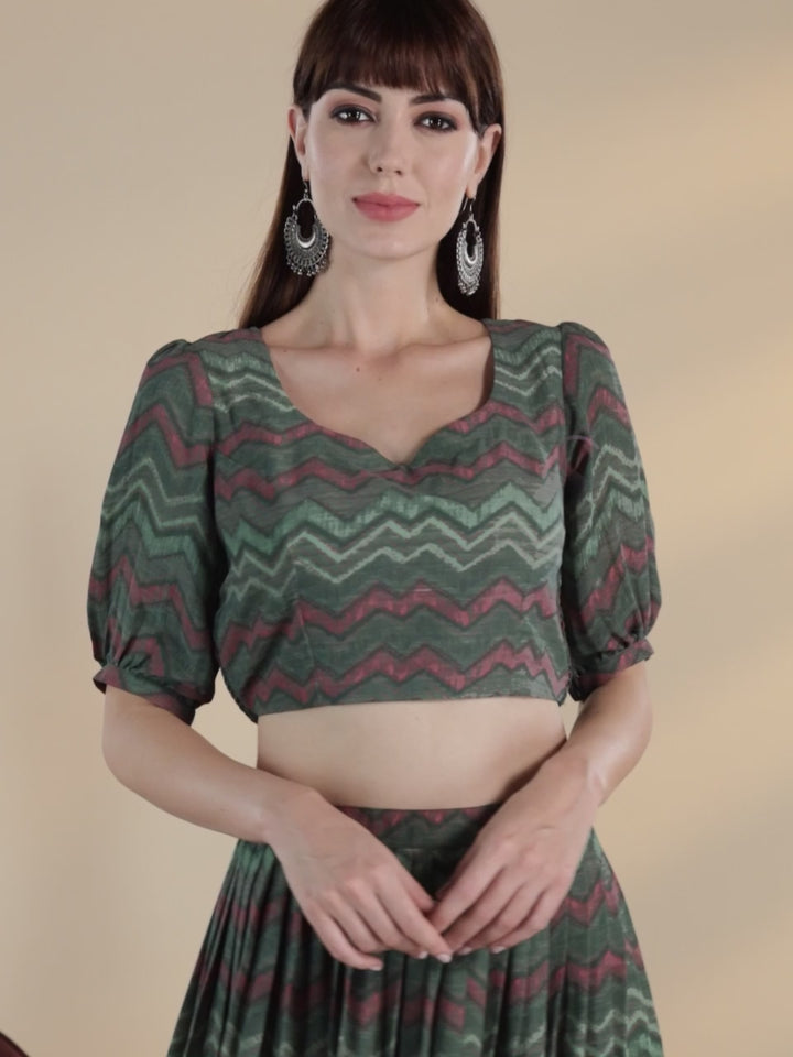 Our 2-piece green and maroon chic lehenga set features a poly georgette blouse with a V-neckline and three-quarter sleeves. Complimented with a Chevron printed polyester slip-on skirt with a flared hem. This style is ideal for daytime festivities.