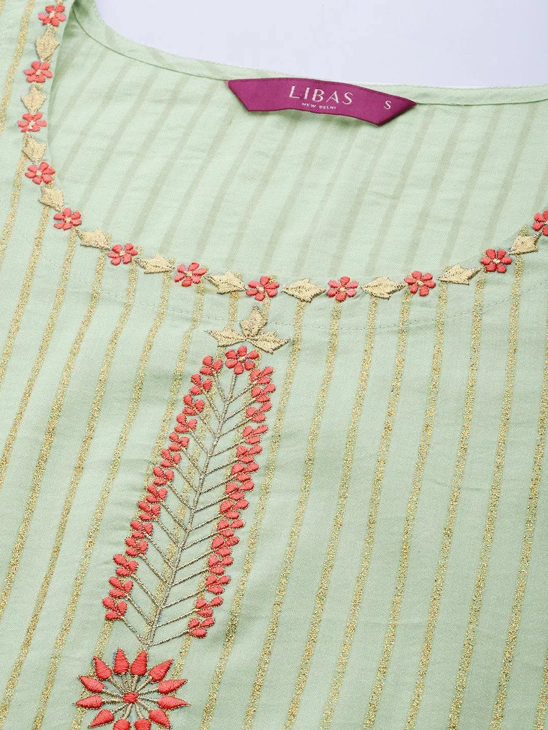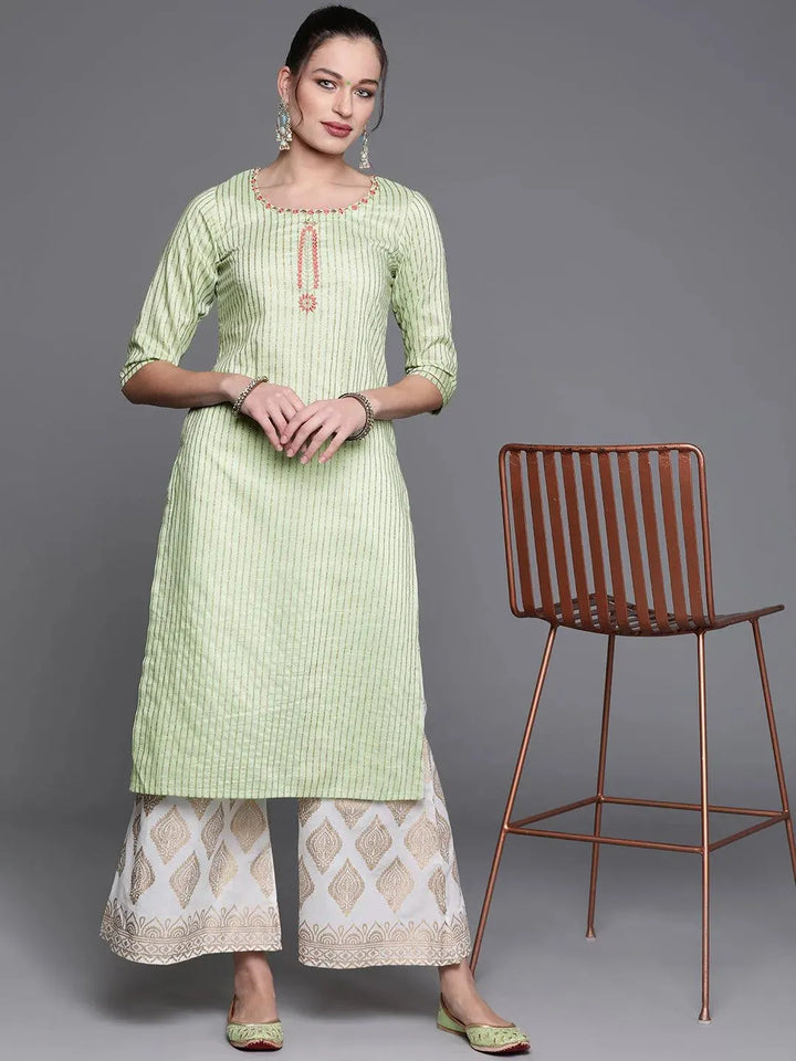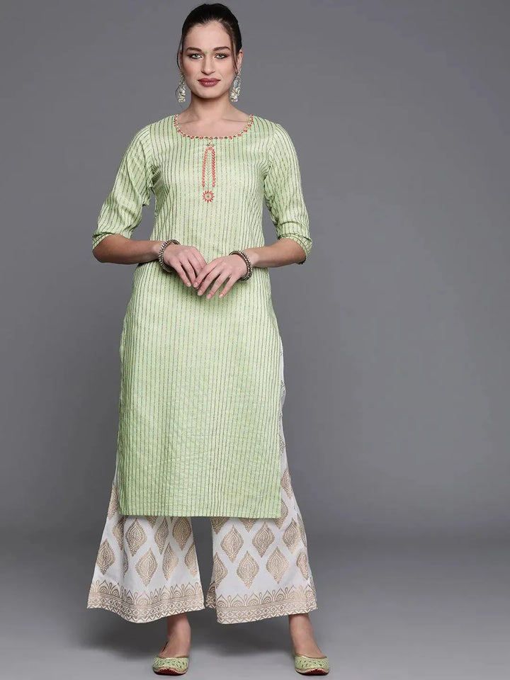 Our green and gold straight-fit kurta, crafted in Chanderi silk fabric features a round neckline, striped design, three-quarter sleeves and a statement yoke with embroidery. This chic style is ideal for casual outings.