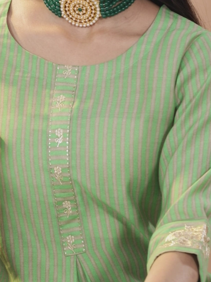 Our green-striped A-line chanderi silk kurta features a round neckline, roomy pockets and three-quarter shirt sleeves. Adorned with embroidered accents, this refreshing style is ideal for work and beyond.