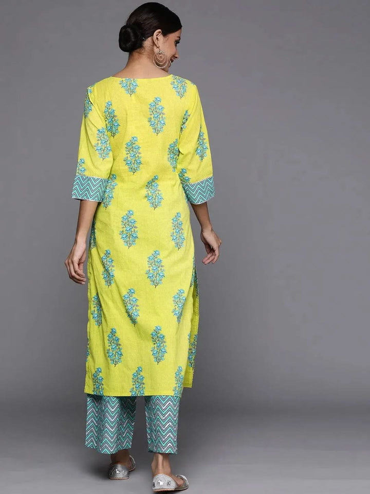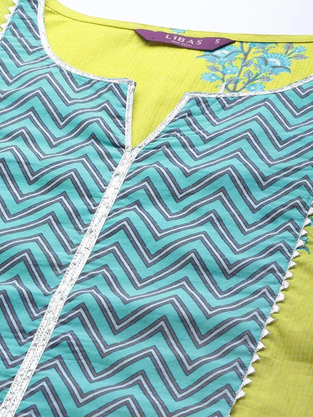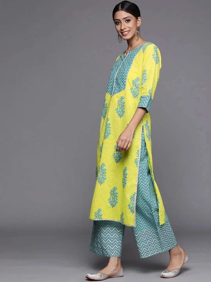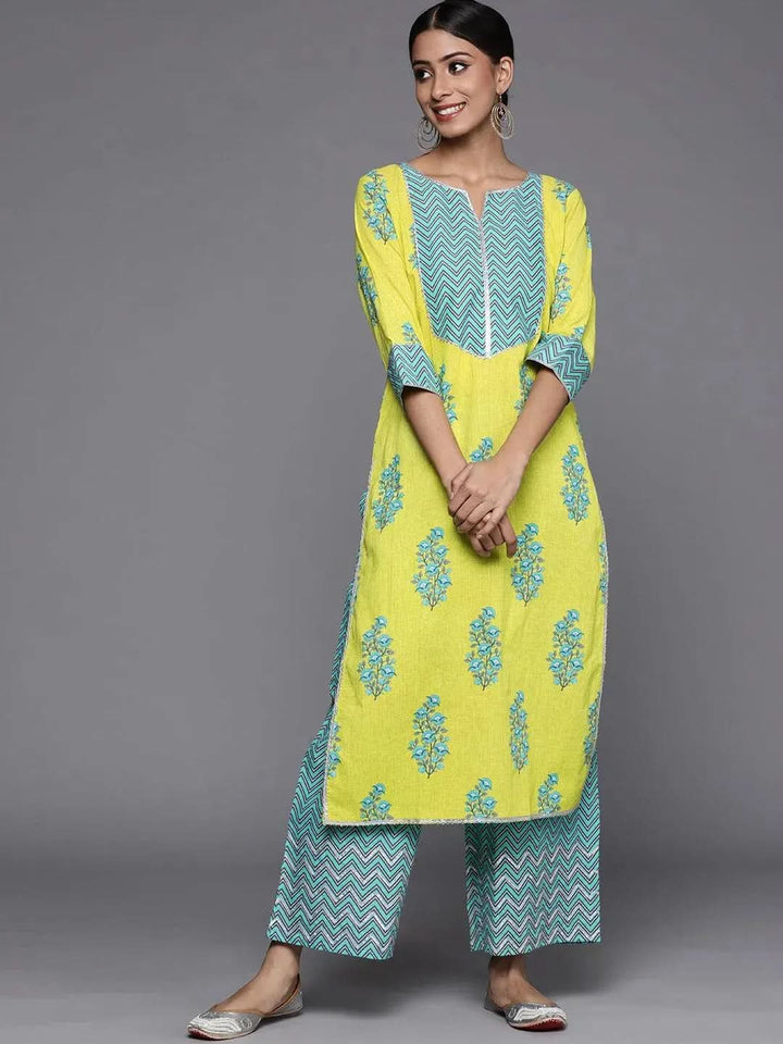 Our green floral print straight-fit cotton kurta features a notched neckline and three-quarter sleeves. Adorned with delicate Gota Patti accents, this charming style is ideal for elevated everyday wear.